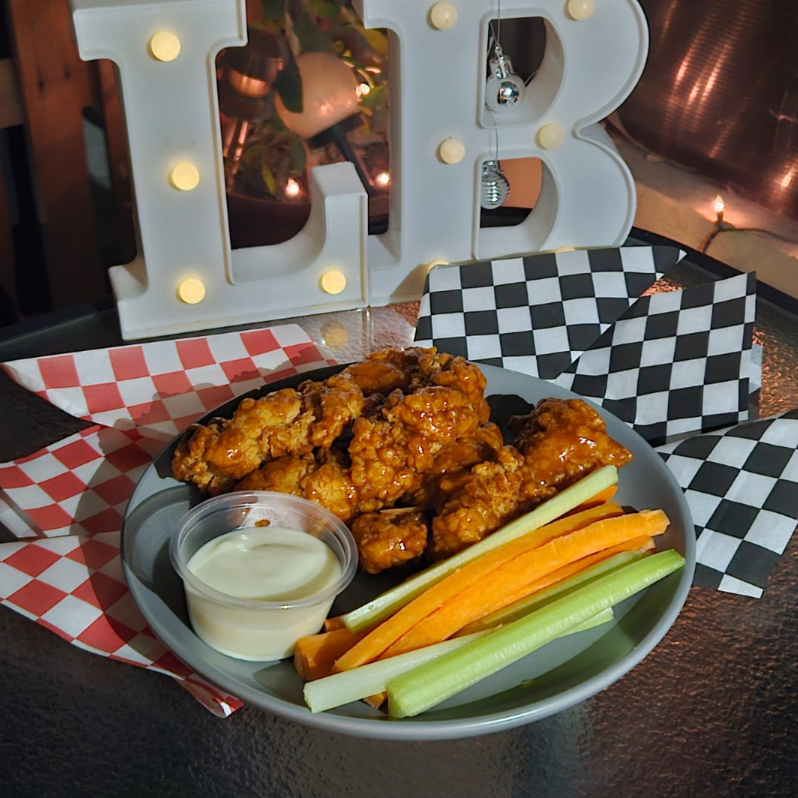 250 gr de boneless (sabor a elegir), bastones de apio y zanahoria acompañao de aderezo ranch.