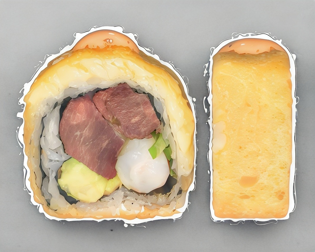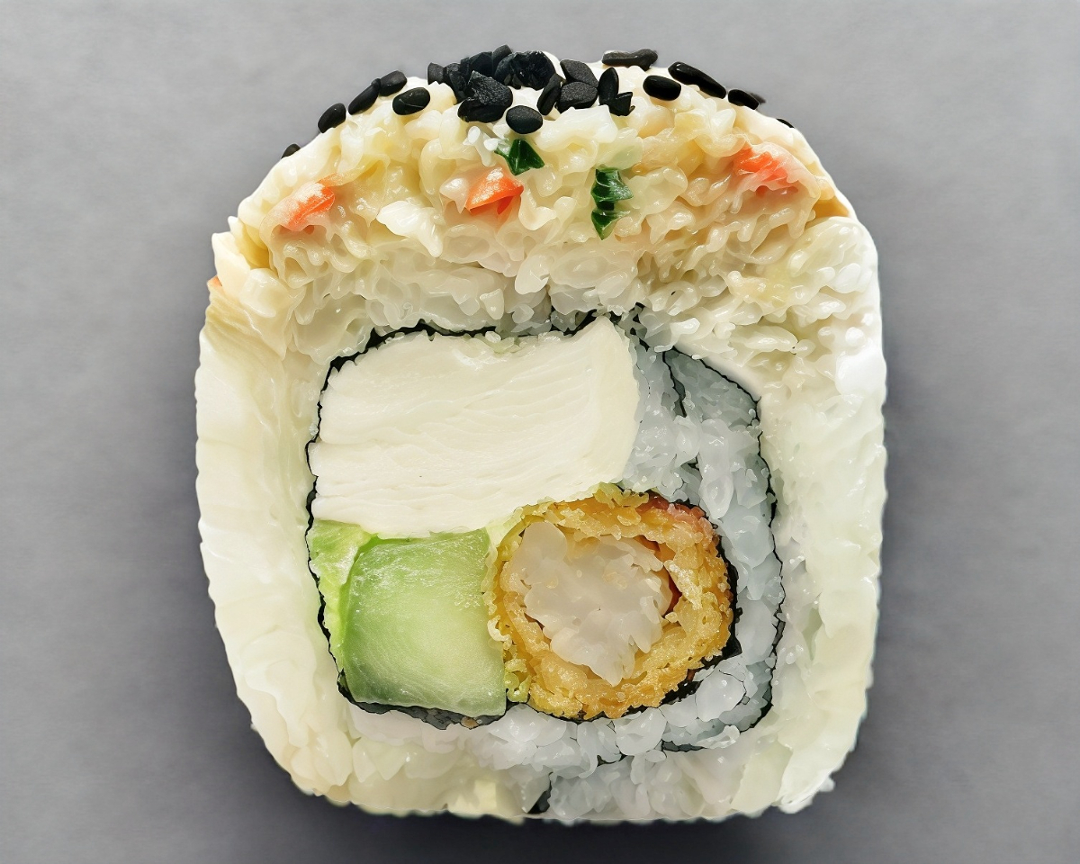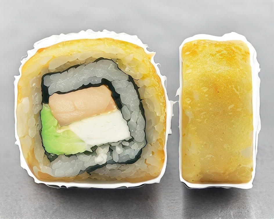 Por dentro: camarón, pepino, aguacate y philadelphia. Por fuera: empanizado.