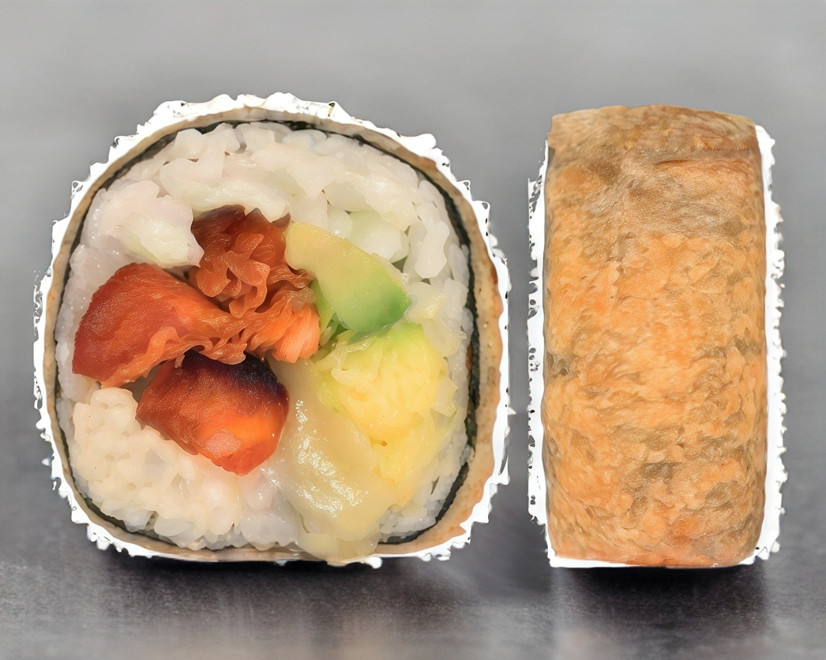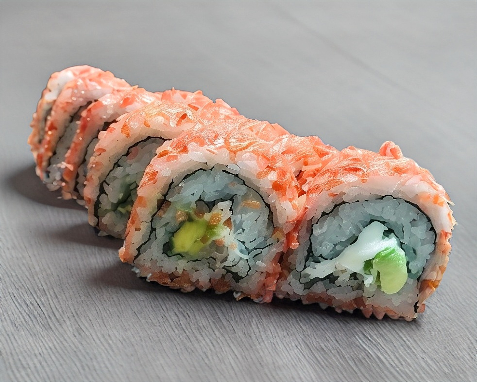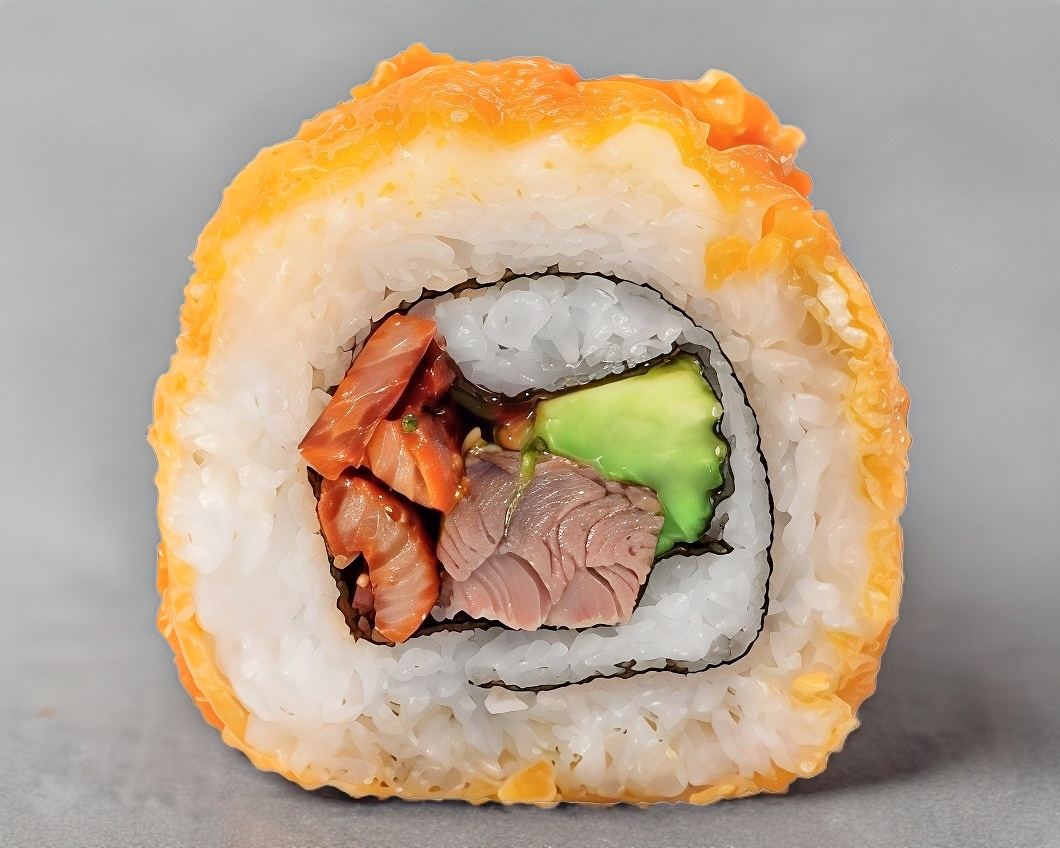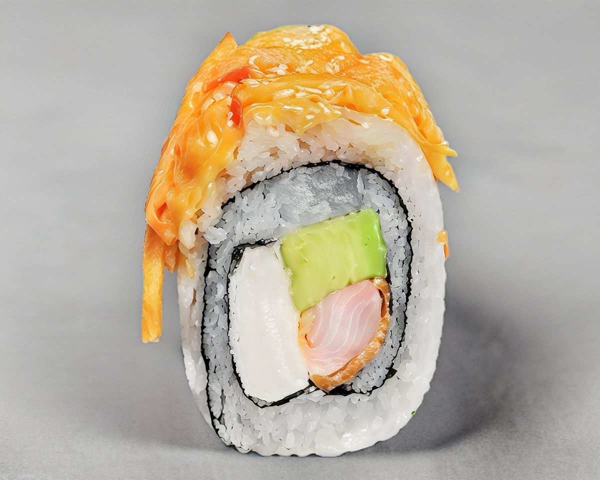Por dentro: camarón, philadelphia y aguacate. Por fuera: surimi y aderezo chipotle.