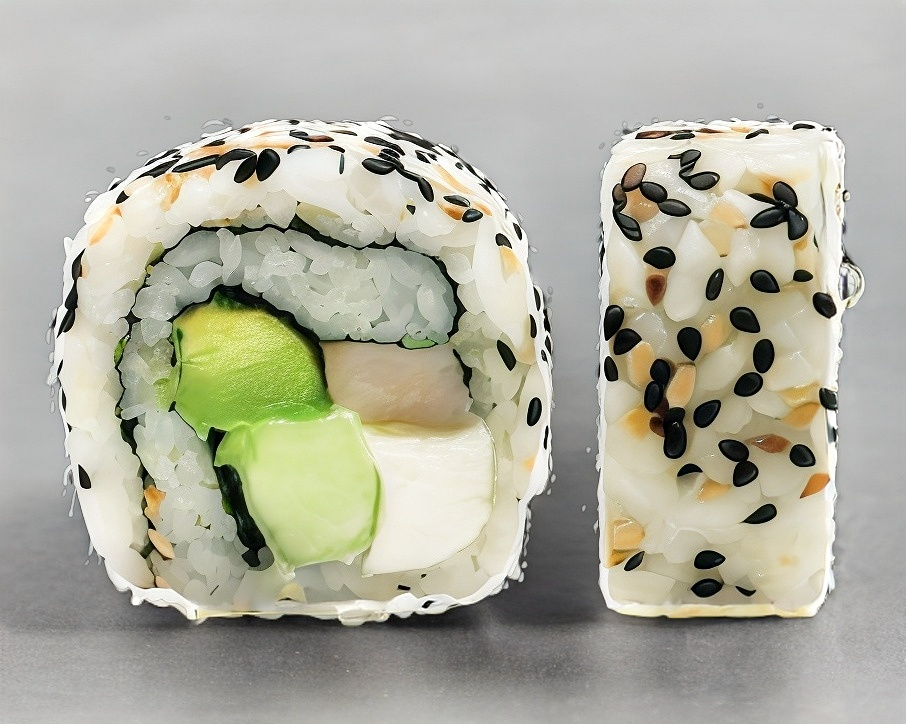 Por dentro: camarón, pepino, philadelphia y aguacate. Por fuera: ajonjolí.