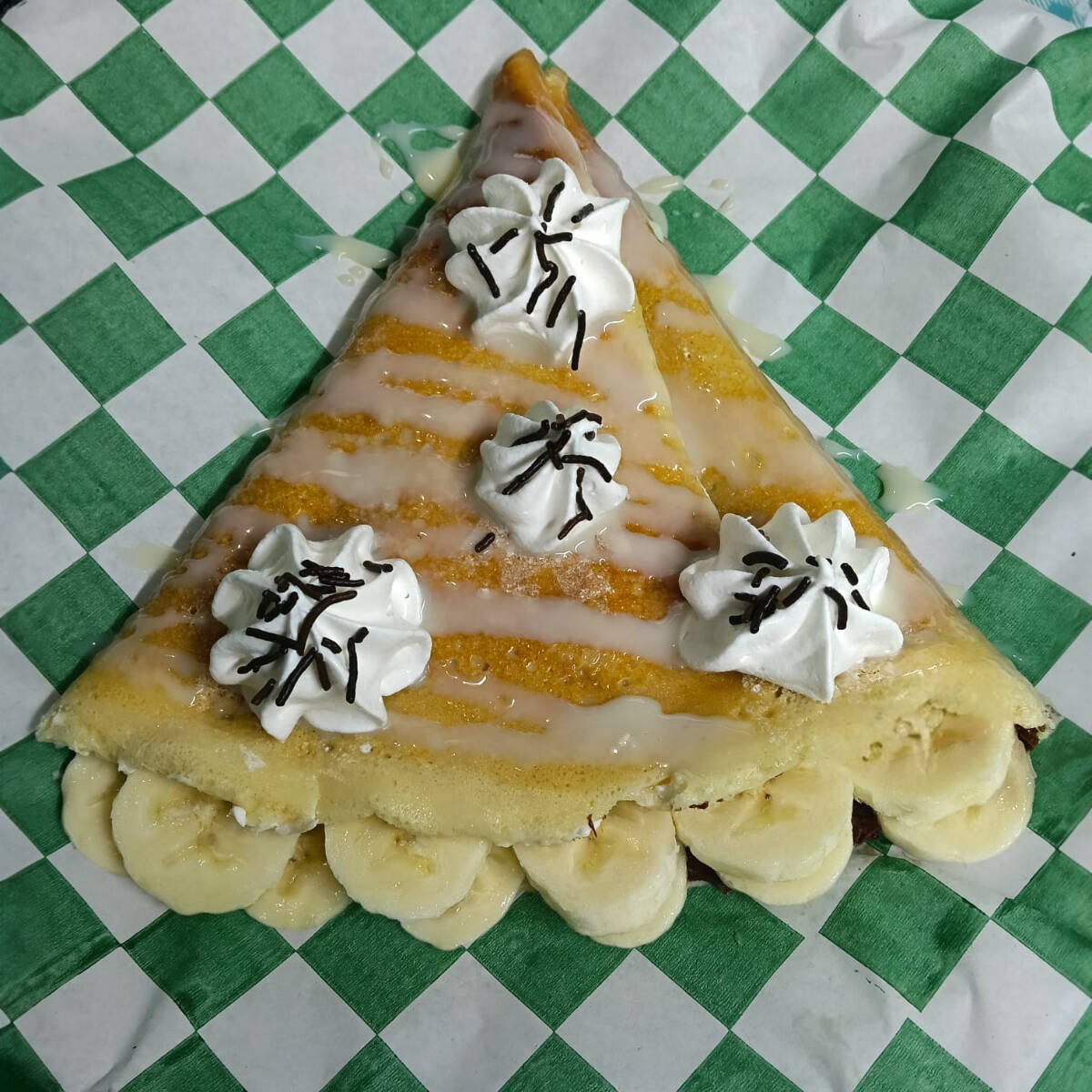 Masa clasica, nutella, platano natural, crema chantilly y cobertura de chocolate