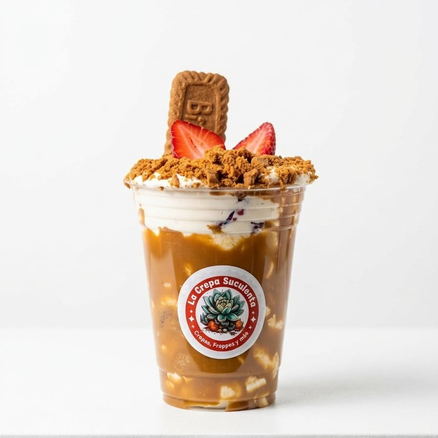 Vaso de 16 Oz. Crema Biscoff, galleta triturada Biscoff, crema de la casa y fresas naturales