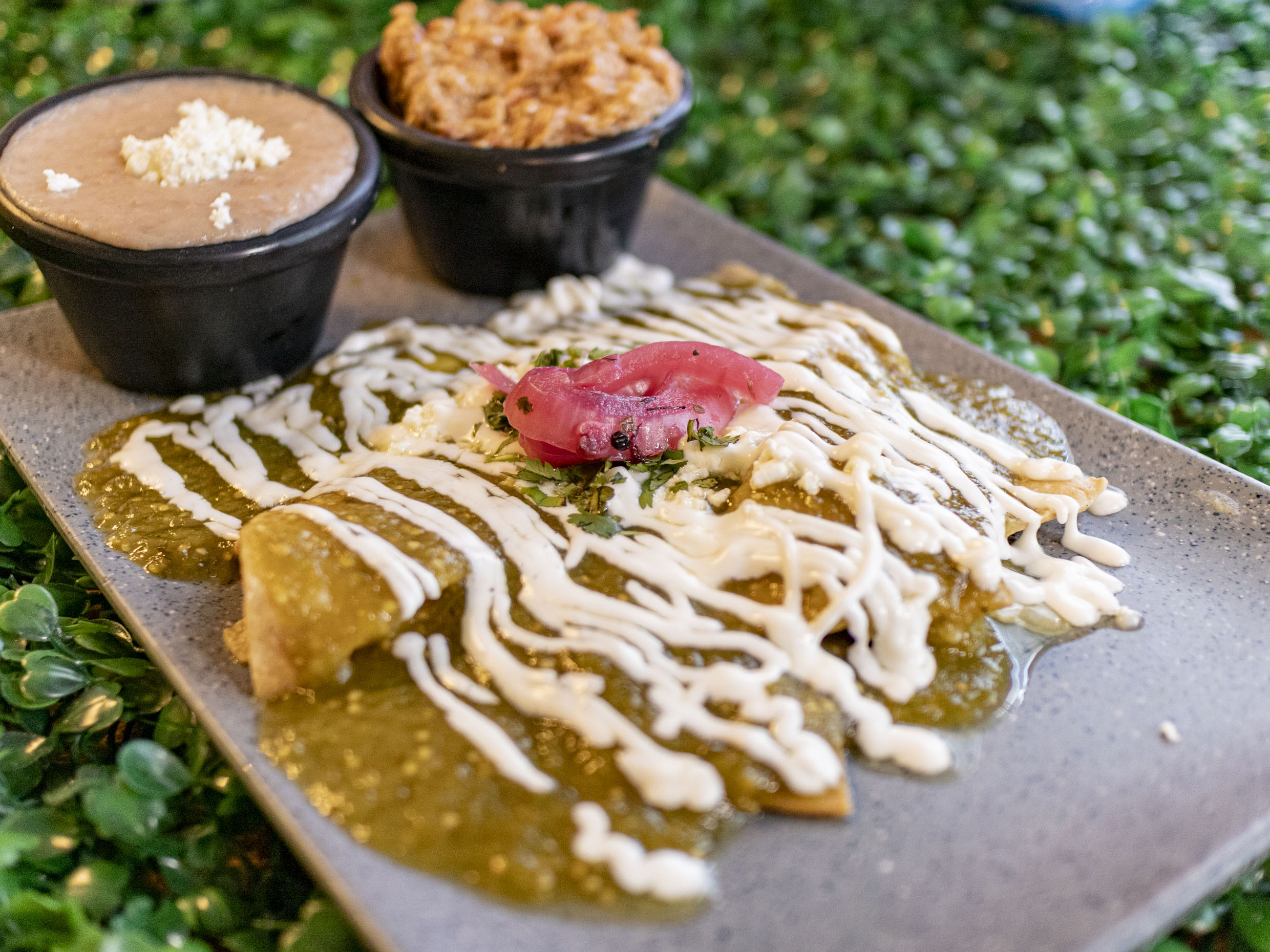 SALSA DE CHILE MORITA CREMOSITA (SI PICA) QUESO MANCHEGO,PANELA,CEBOLLA,CILANTRO,CREMA Y AGUACATE