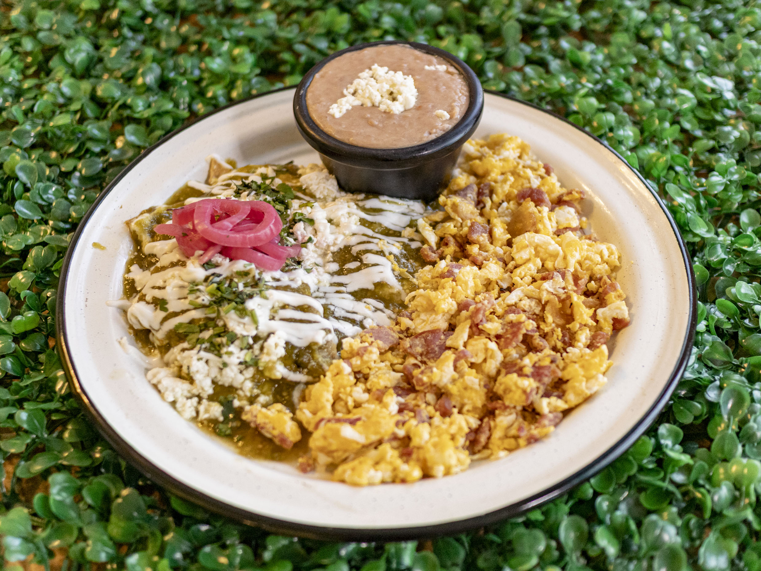 HUEVO CON TOCINO ACOMPAÑADO DE FRIJOLES REFRITOS Y UNA PORCION DE CHILAQUILES