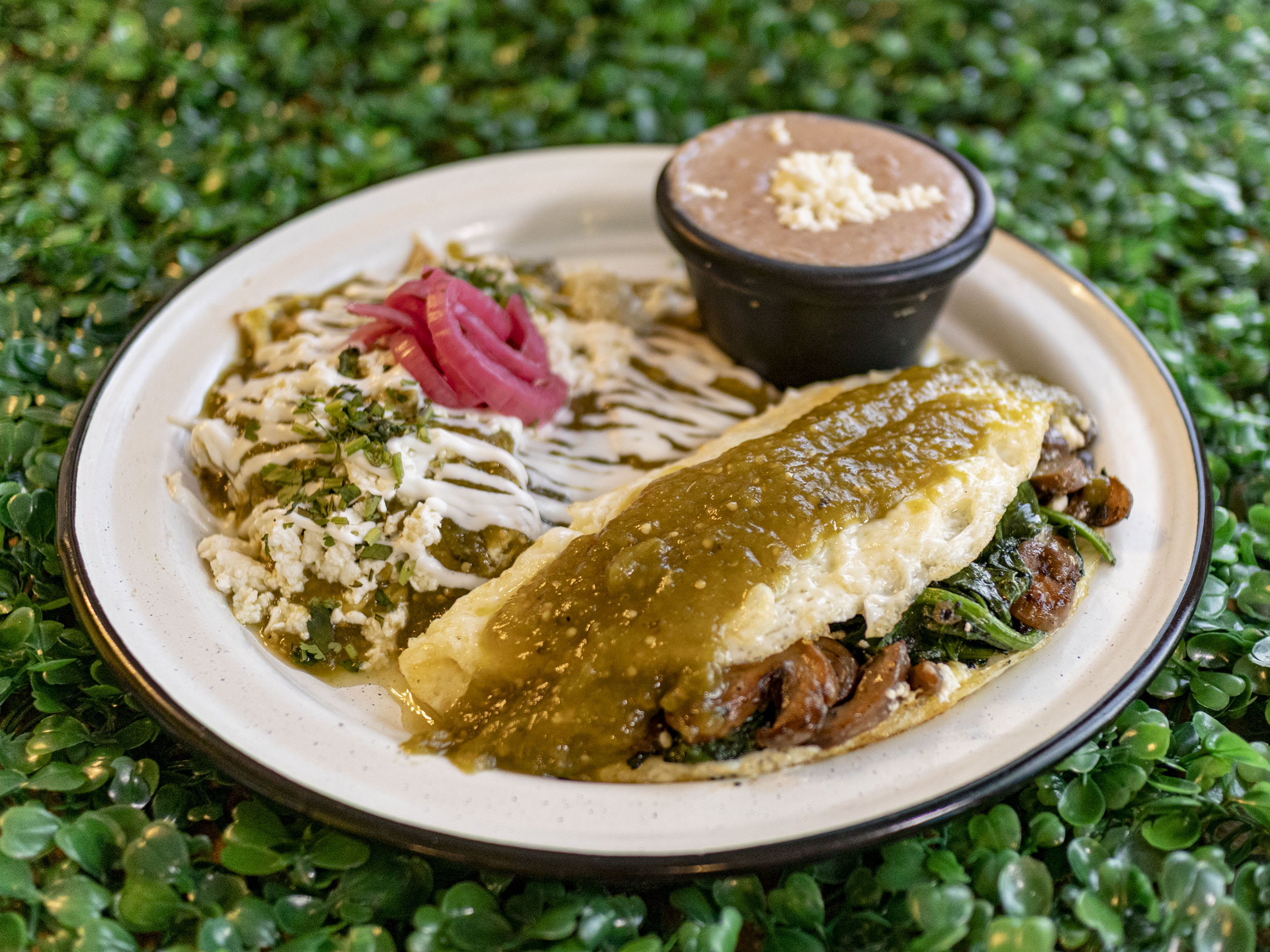 SALSA DE TOMATILLO Y CHILE SERRANO (NO PICA) TOPPINGS: QUESO MANCHEGO,PANELA,CEBOLLA,CILANTRO,CREMA Y AGUACATE