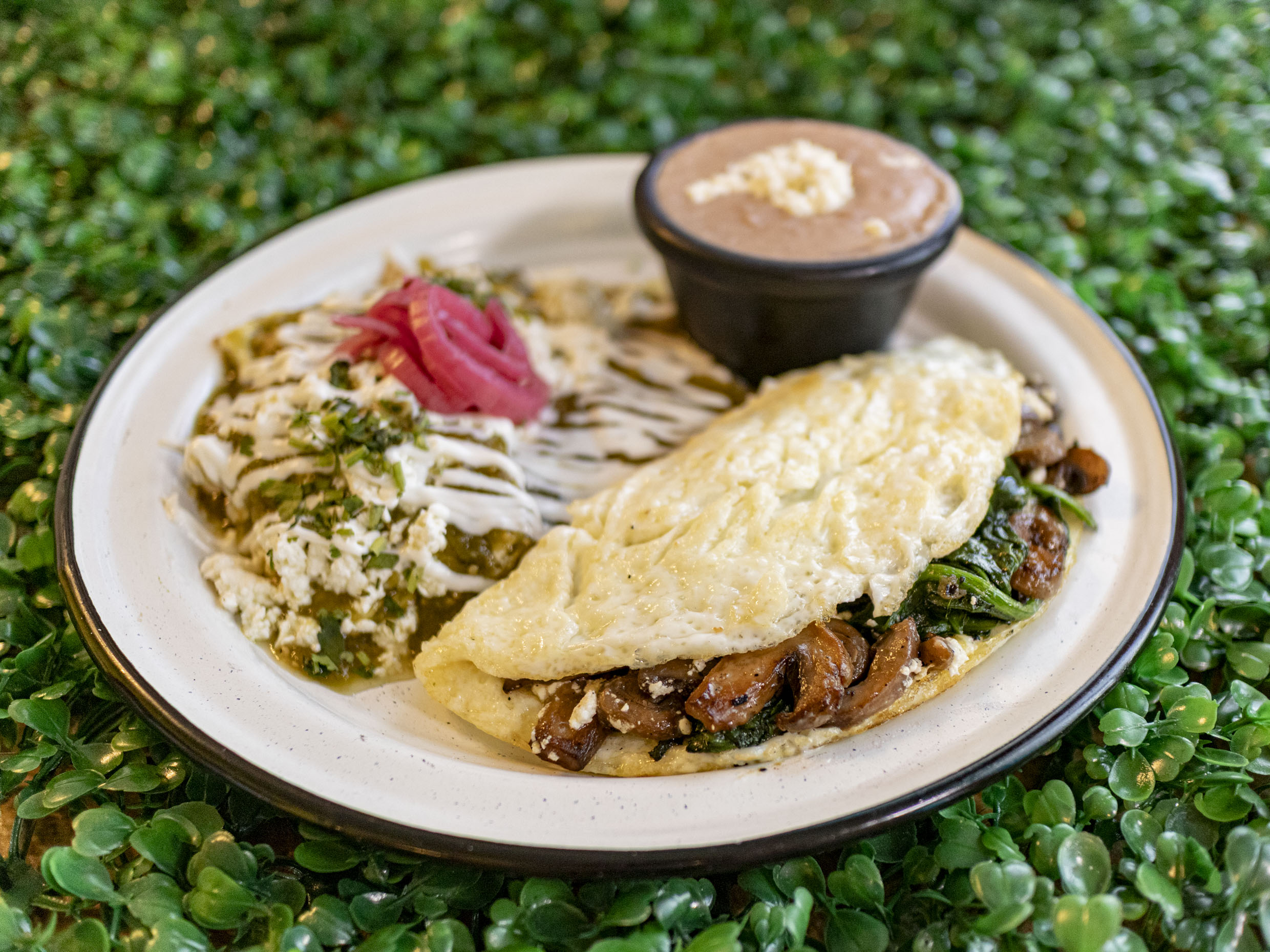 SOLO CLARAS,QUESO PANELA, ESPINACA Y CHAMPIÑONES