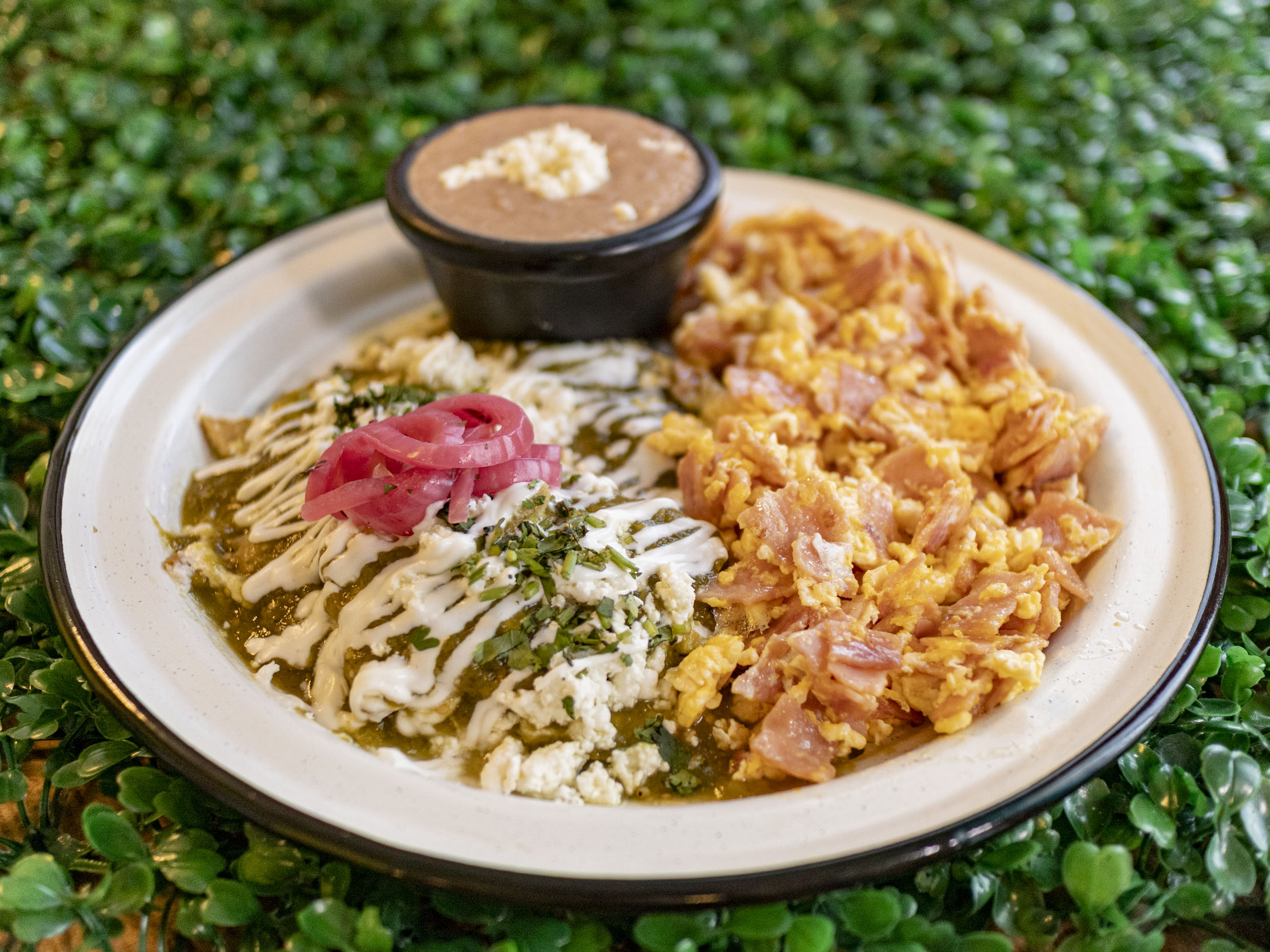 HUEVO CON JAMON ACOMPAÑADOS DE FRIJOLES REFRITOS Y UNA PORCION DE CHILAQUILES