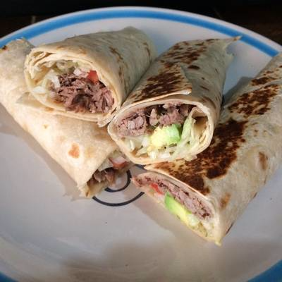 Deliciosa tortilla grande de harina de trigo enrollada y rellena de frijoles refritos y guiso