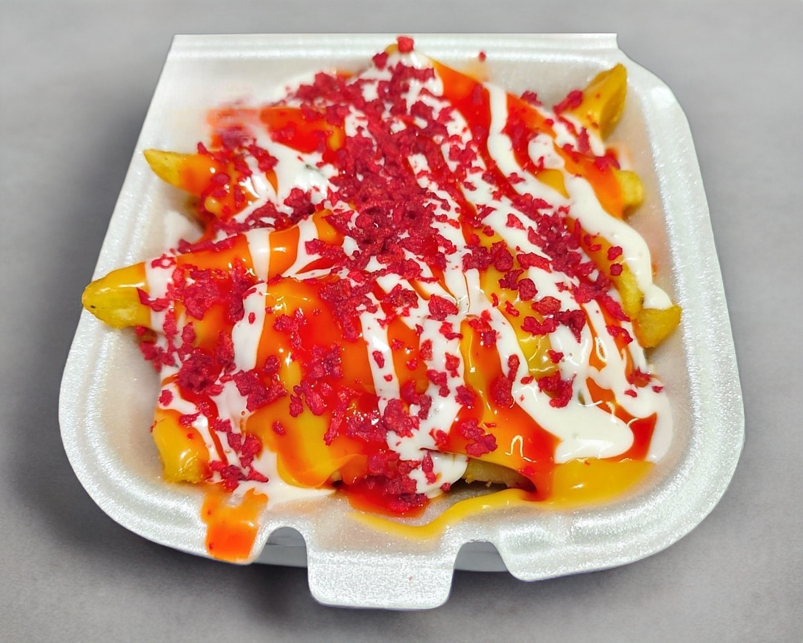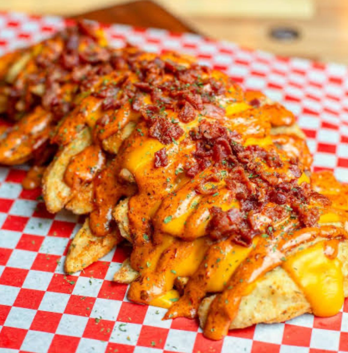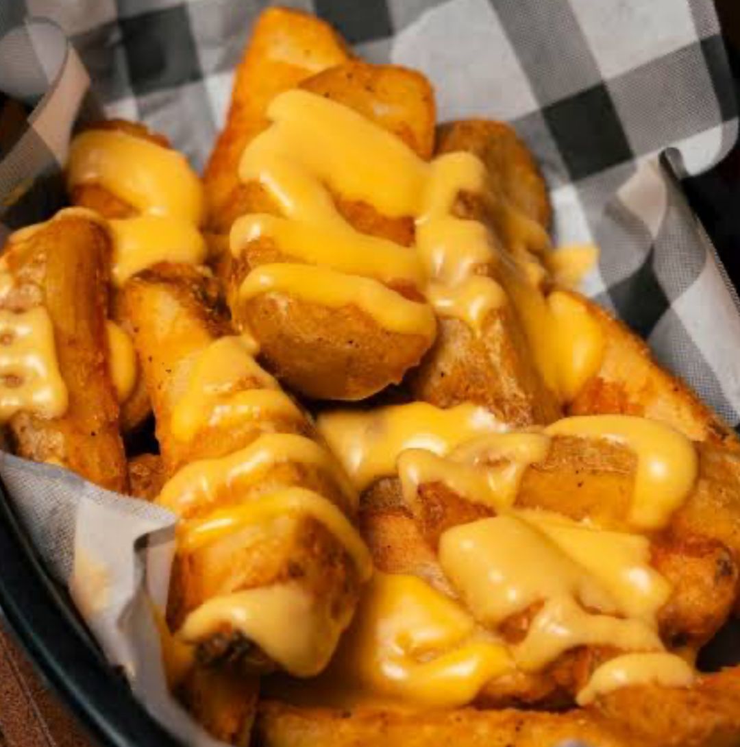 (Papas a la francesa sazonadas con pimienta limón, banadas con aderezo de queso y tocino deshidratado)