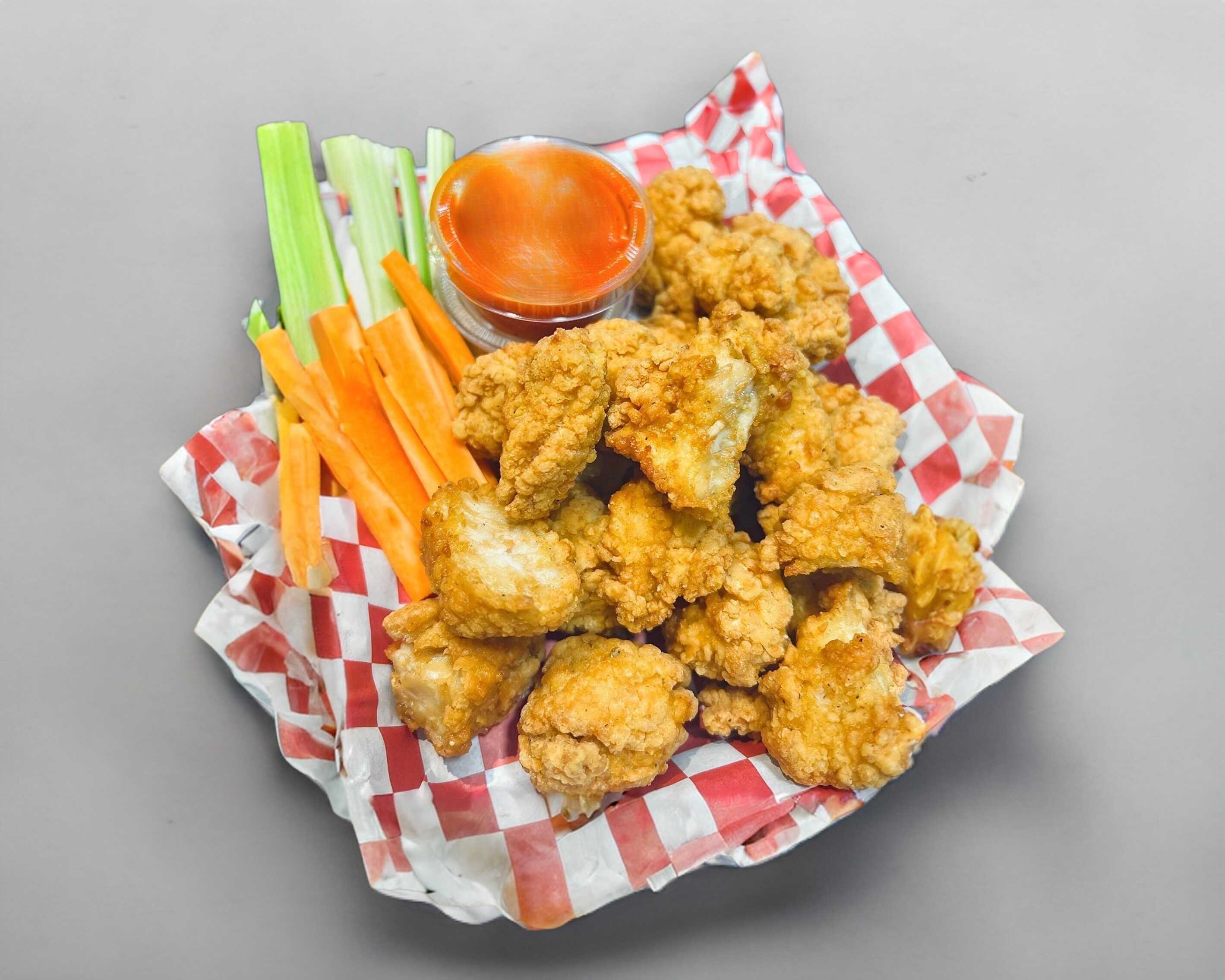 8-9 piezas de bonelees, bañadas en las salsas de su preferencia , sticks de apio y zanahoria , 2 onzas de ranch