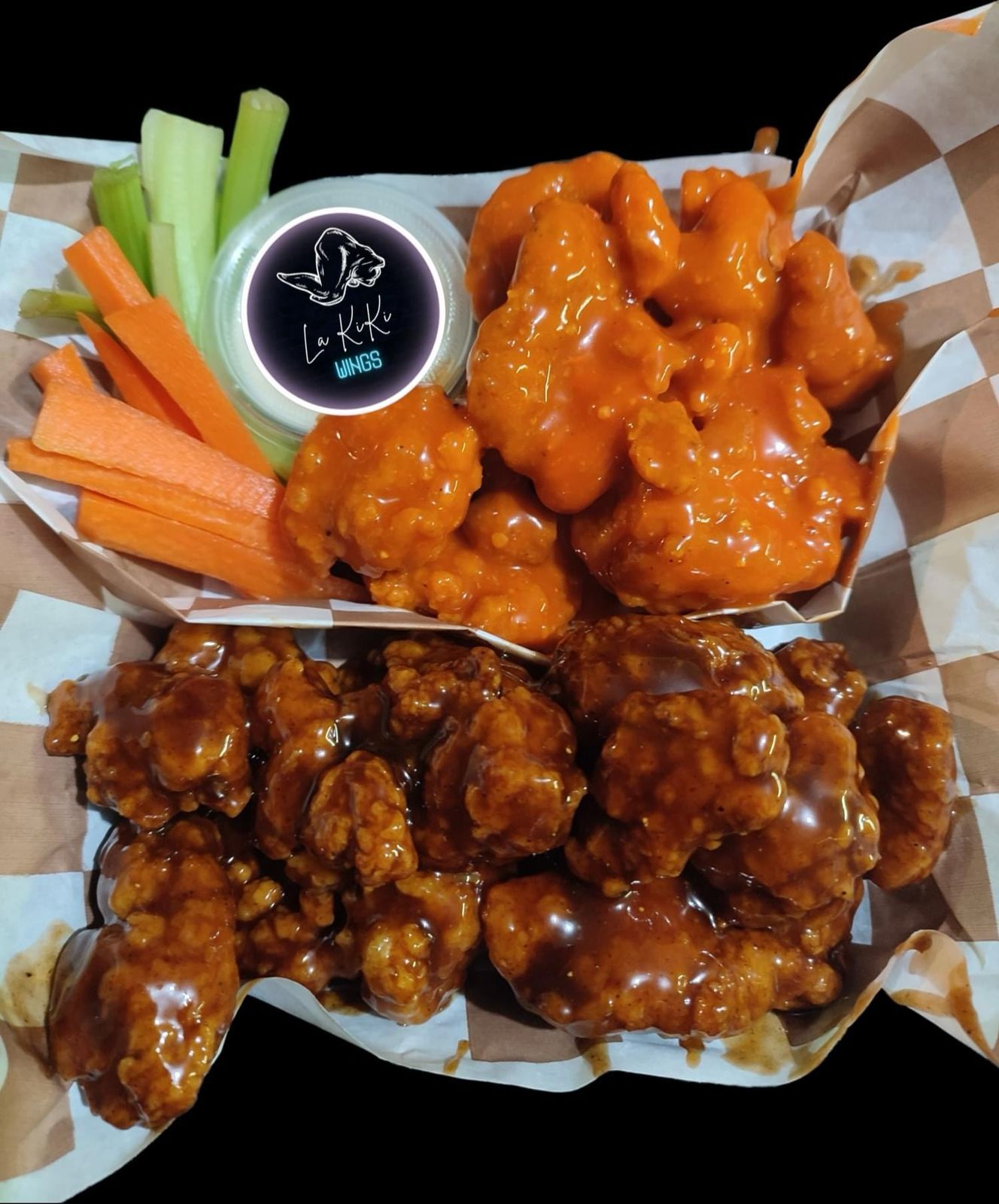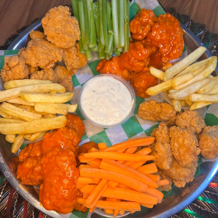 25-30 piezas de Boneless, bañados perfectamente en la salsa de su preferencia, sticks de apio y zanahoria, 2 oz de ranch