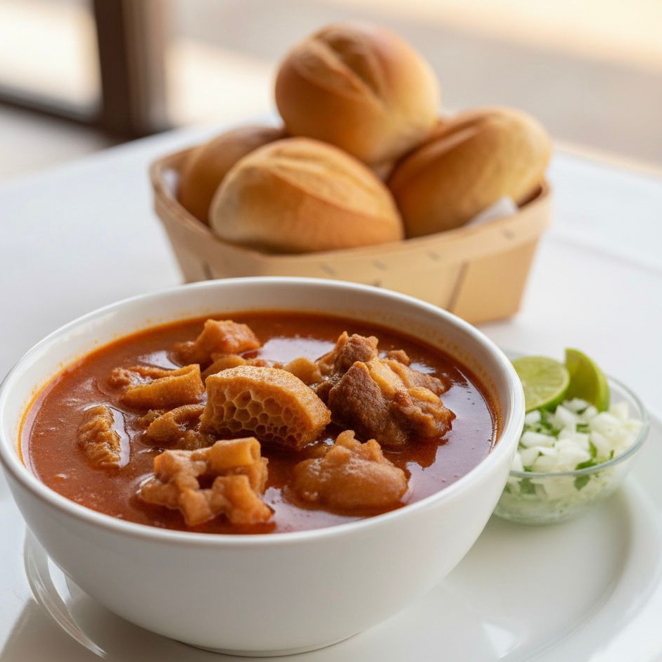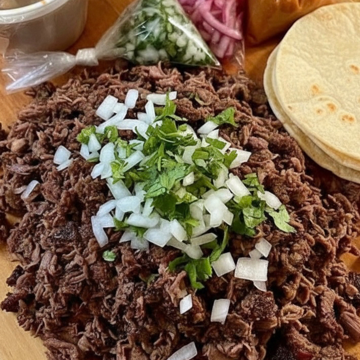 Barbacoa de labio de novillo acompañada con salsas, vinagreta y cebolla con cilantro