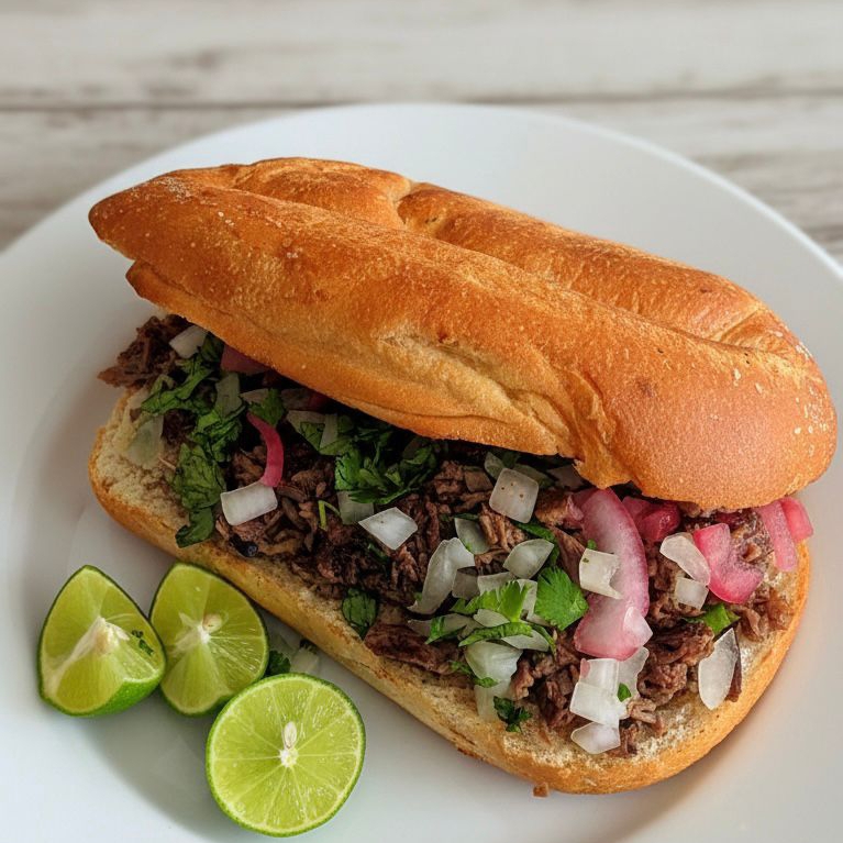 Lonche de barbacoa maciza acompañado de salsas cebolla con cilantro y vinagreta