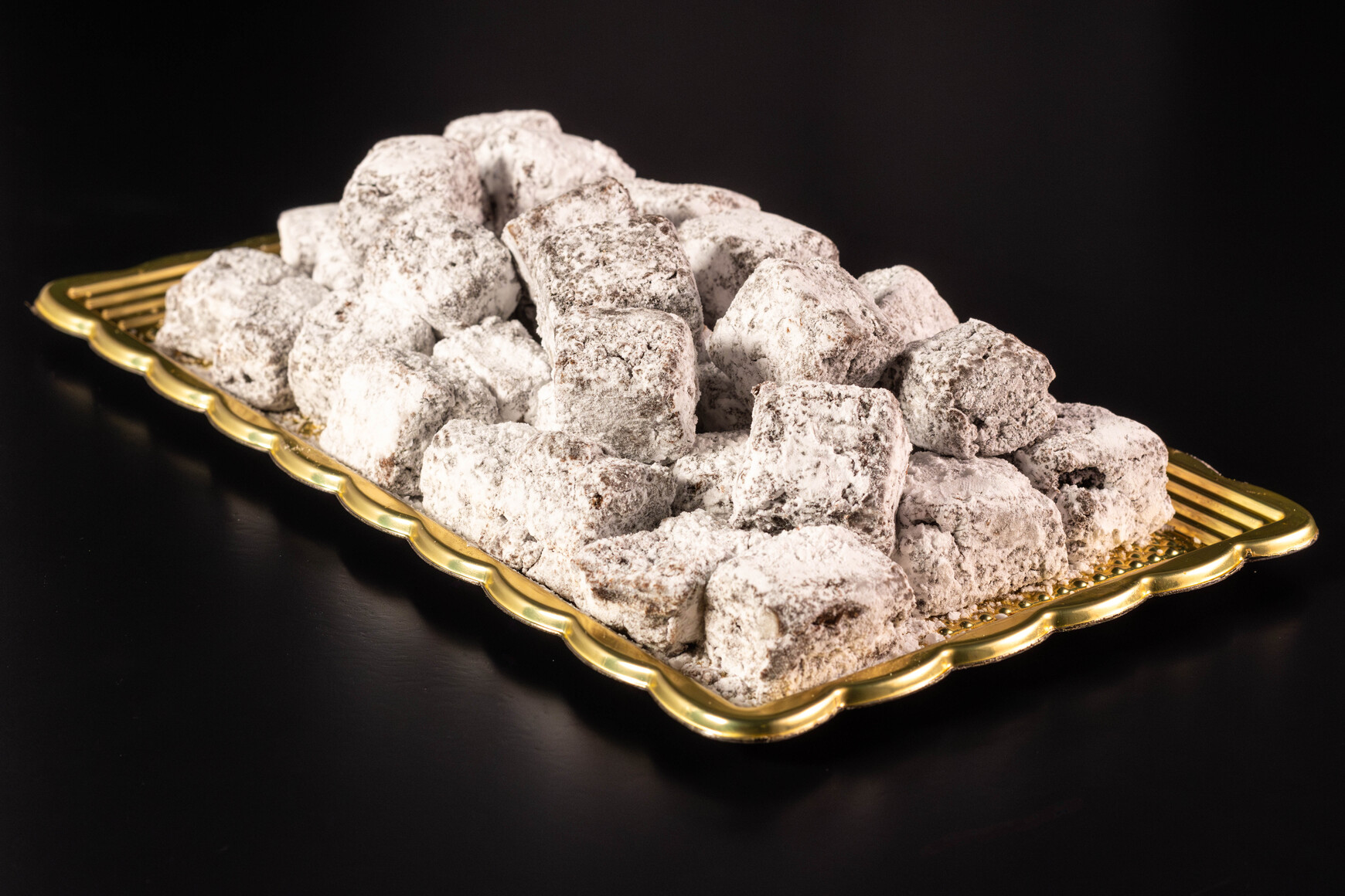 Charola con bites de brownie espolvoreados de azúcar pulverizada