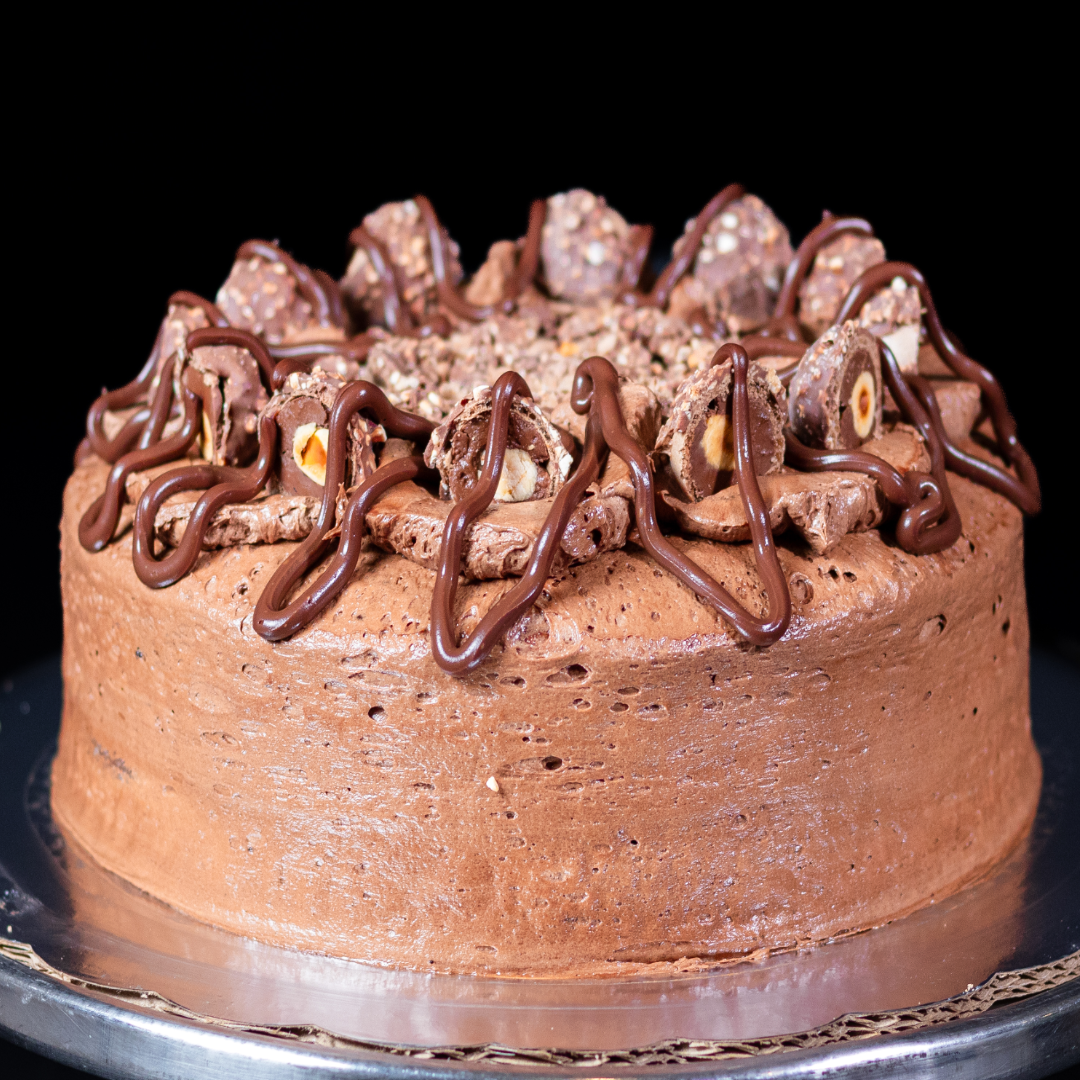 Pan de chocolate relleno de Nutella, betún de chocolate y ganache. Decorado con Ferrero Rocher.