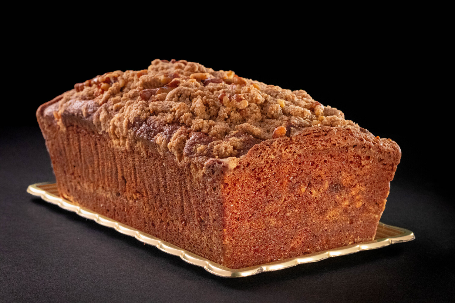 Panque con un centro marmoleado de canela, nuez, y un crumble de azucar con nuez como topping.