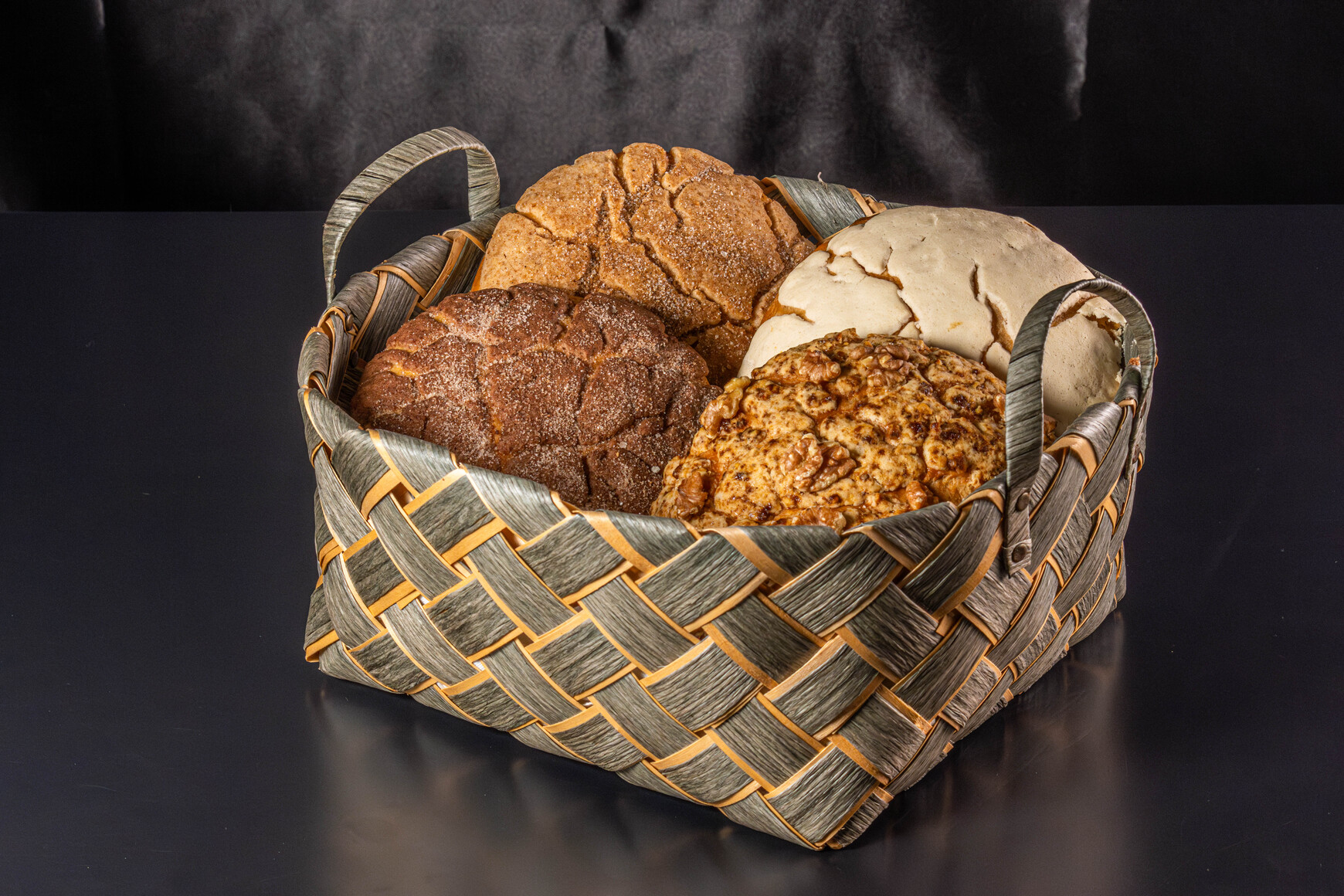 Pan tipo concha elaborado con masa de nata de granja de Chiapas y 100% mantequilla, cubierto con costra dulce de vainilla y relleno de Lotus