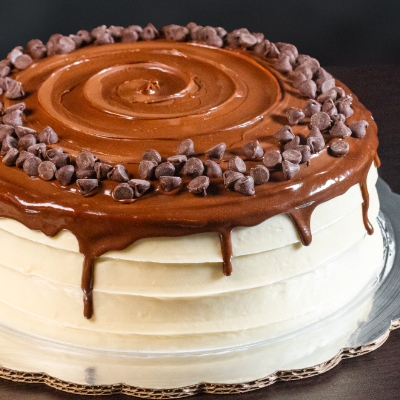 Pan de chocolate con capas de Nutella, dulce de leche, cacahuate garapiñado y betún de vainilla a base de Philadelphia