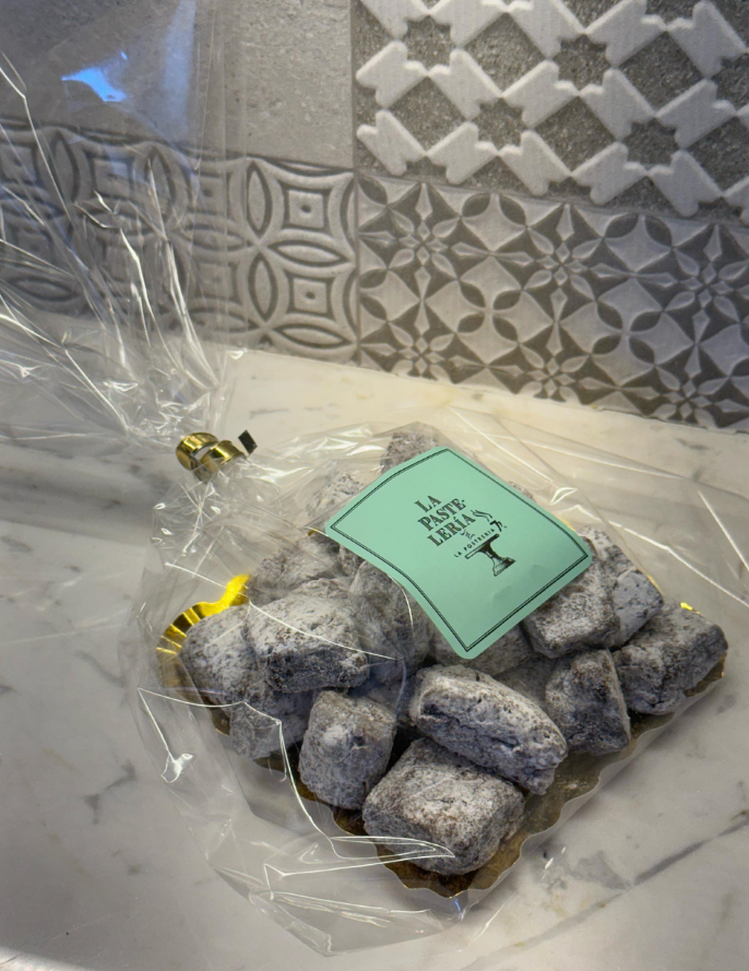 Charola chica con bites de brownie espolvoreados de azúcar pulverizada