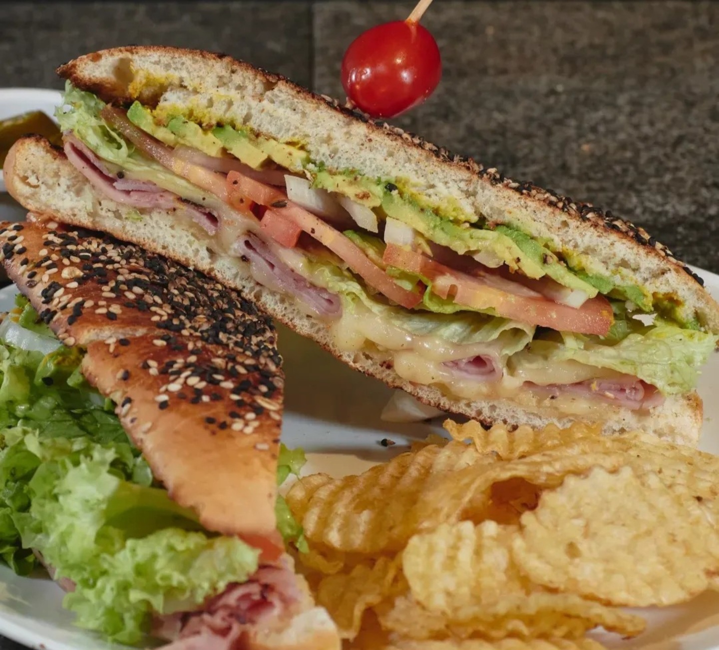 Carne de res, jamón de pavo, queso manchego, lechuga, tomate, aguacate, cebolla, mostaza y mayonesa casera acompañada de aderezo chipotle y jalapeños.Carne 150 gr, Jamón 20 gr
