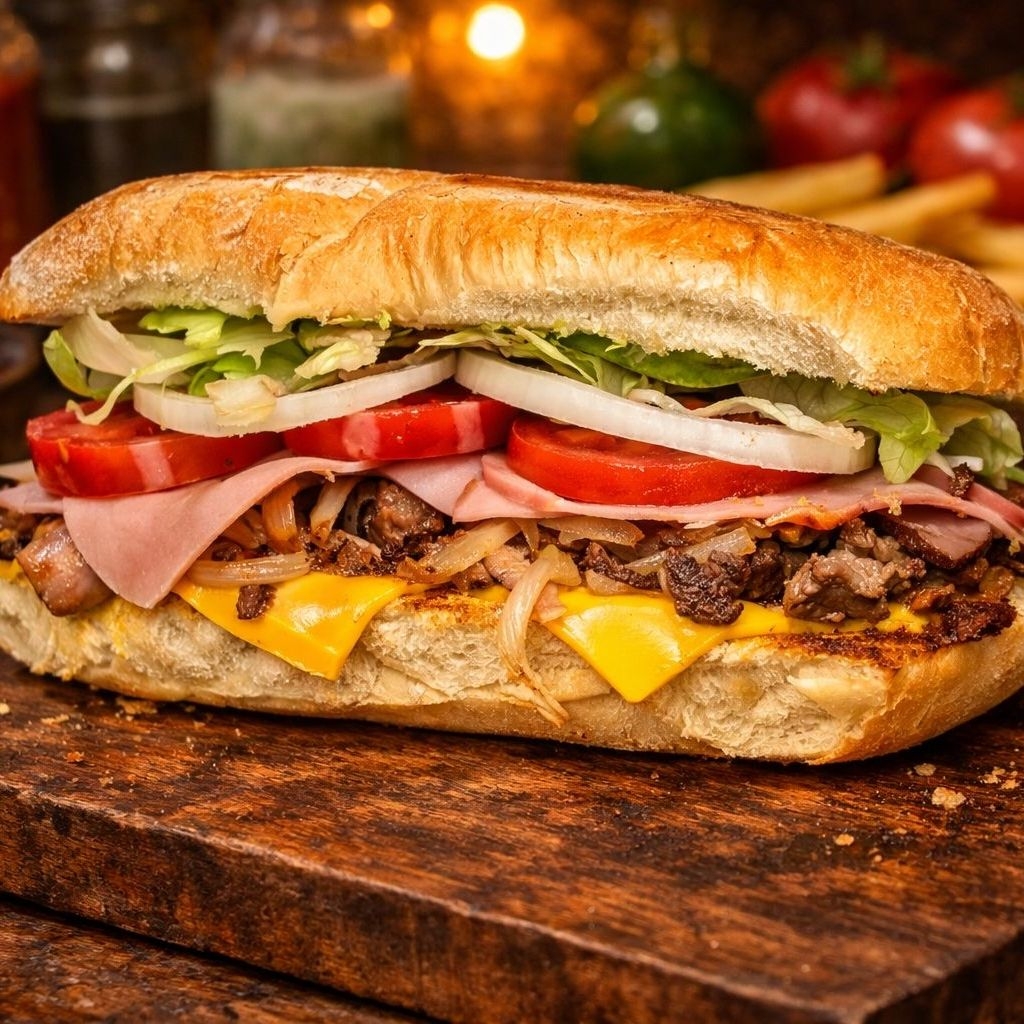 Pa' que no te pienses!! Pierna de cerdo y bistec fileteado, jamón, queso americano, aguacate, cebolla asada, vegetales y aderezos