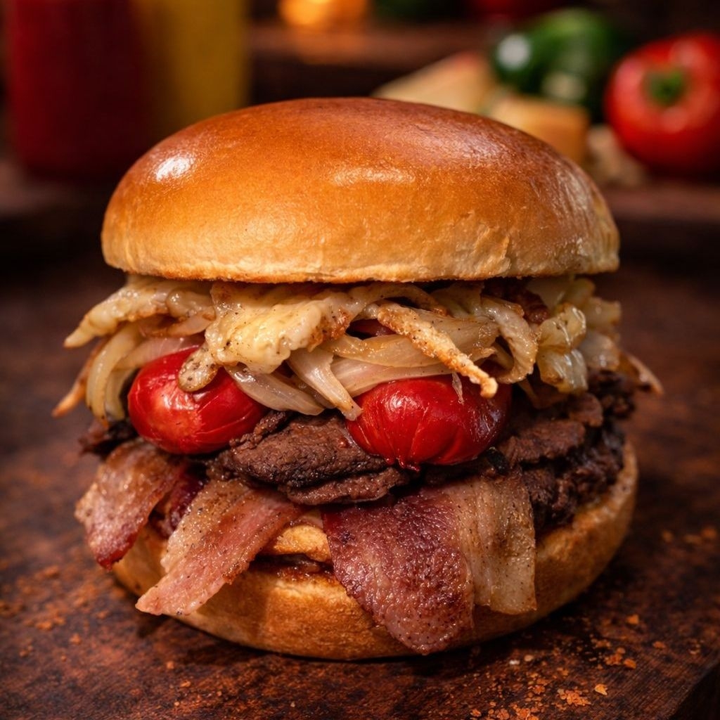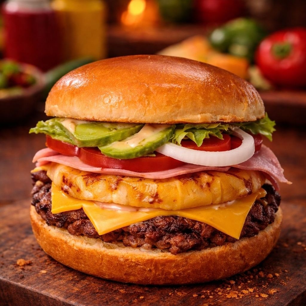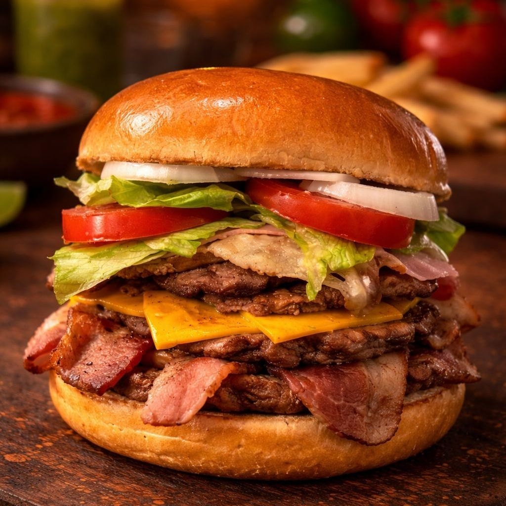 Tienes que probarla!! Doble carne de res, doble jamón, doble queso americano y queso manchego, aguacate, vegetales, aderezo y tocino acompañada con papas a la francesa