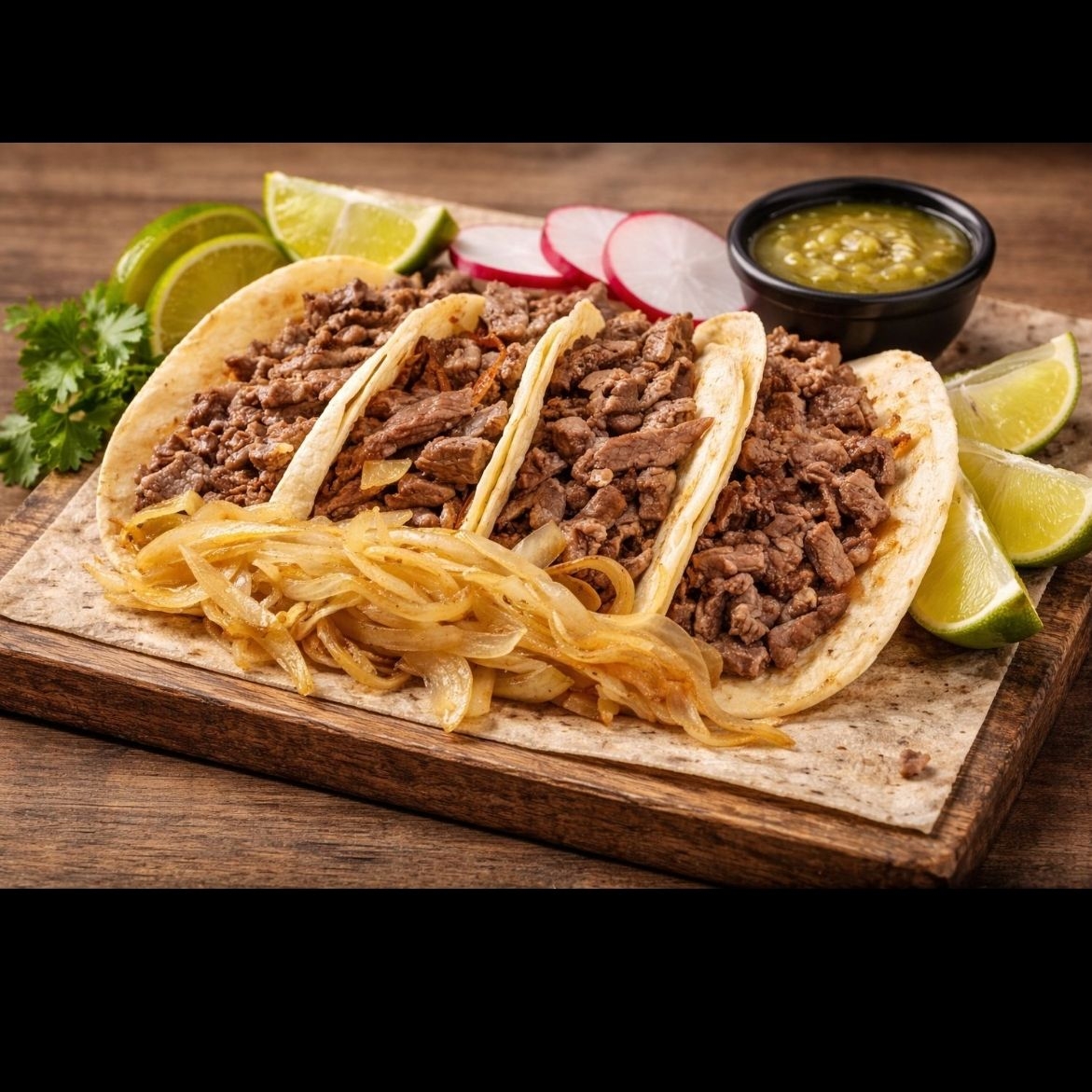 Orden de 5 tacos de harina acompañados de cebolla asada