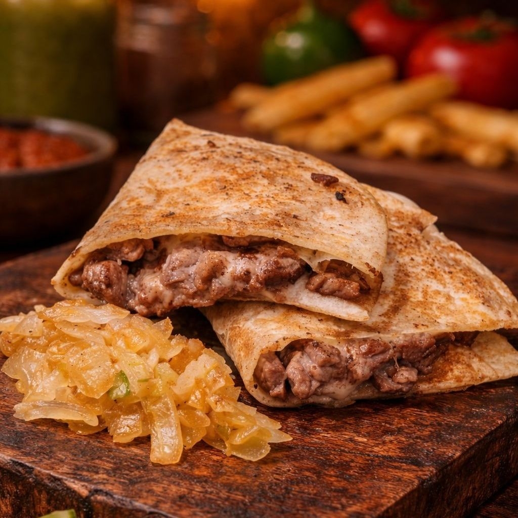 Una tortilla de burrito rellena de bistec con queso acompañada de cebolla asada