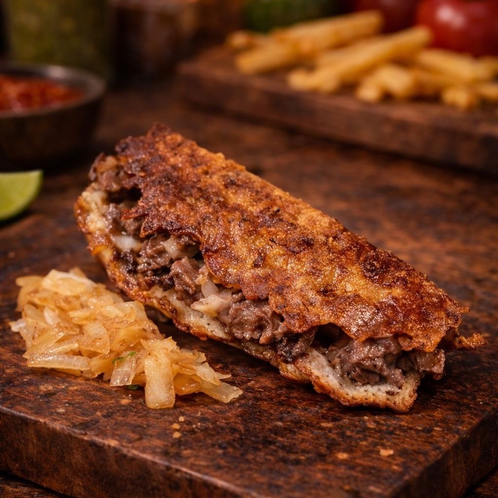 Costra de queso en forma de taco llena de bistec acompañada de 5 tortillas de harina