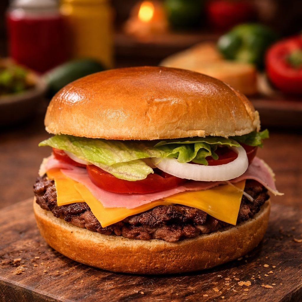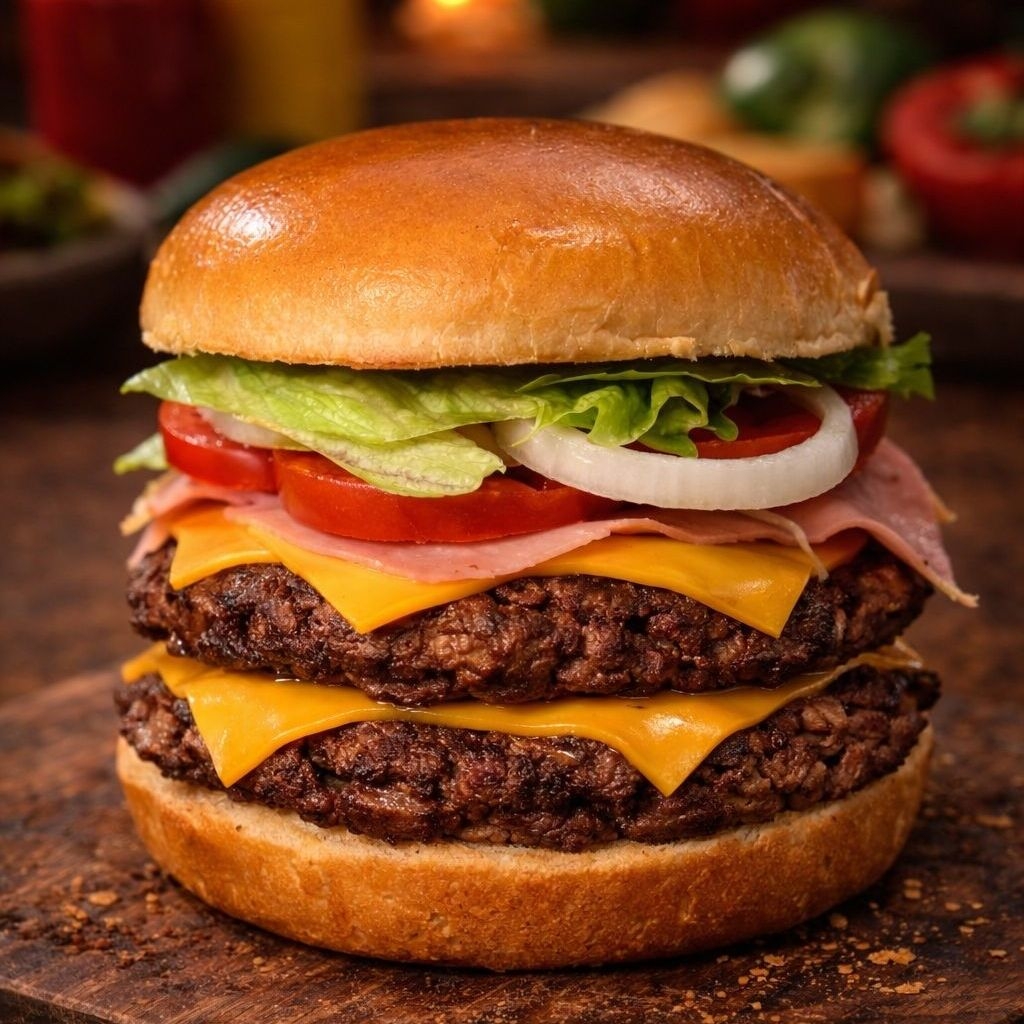 Nuestra consentida!! Doble carne de res, doble jamón, doble queso americano, aguacate, vegetales y aderezos acompañada con papas a la francesa