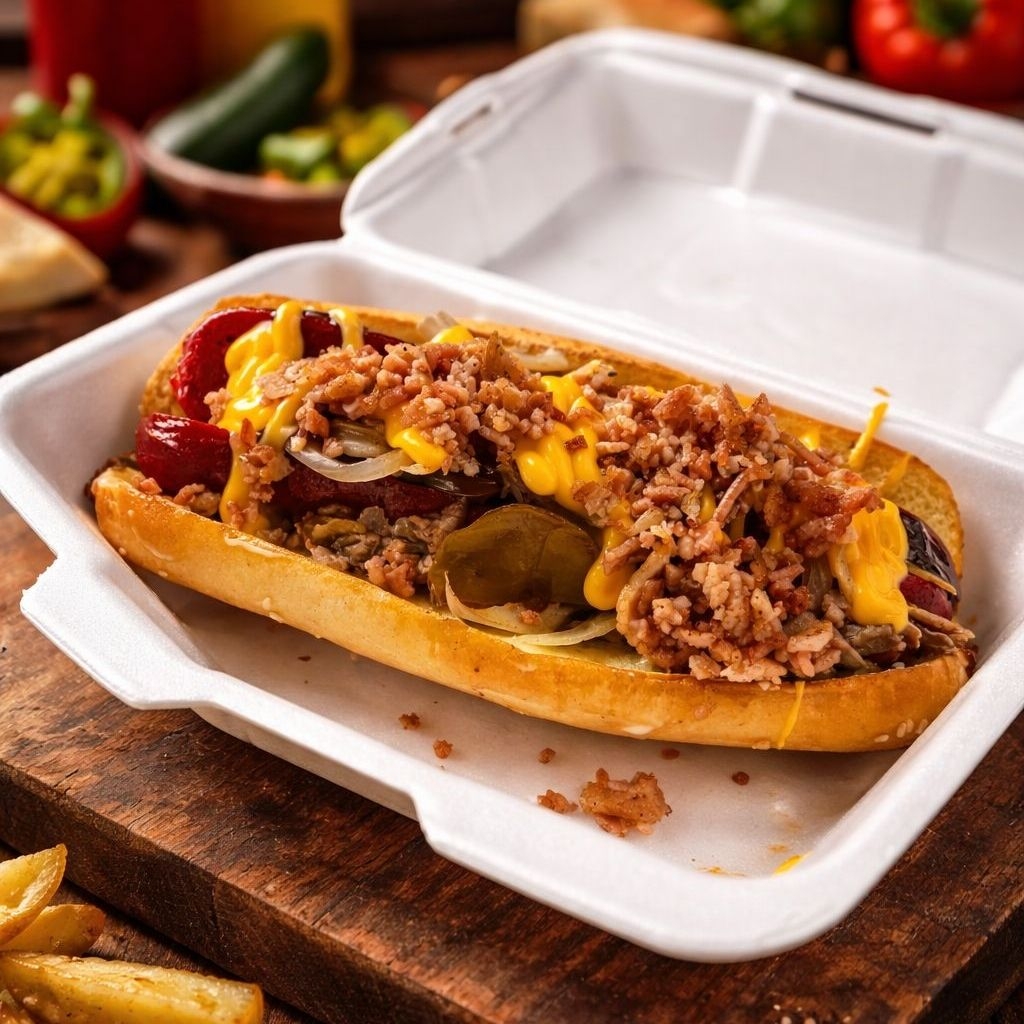 De lo más nuevo!! Salchicha para asar jumbo, aderezos, queso líquido, barbecue, cebolla asada y tocino en trocitos acompañada de papas a la francesa