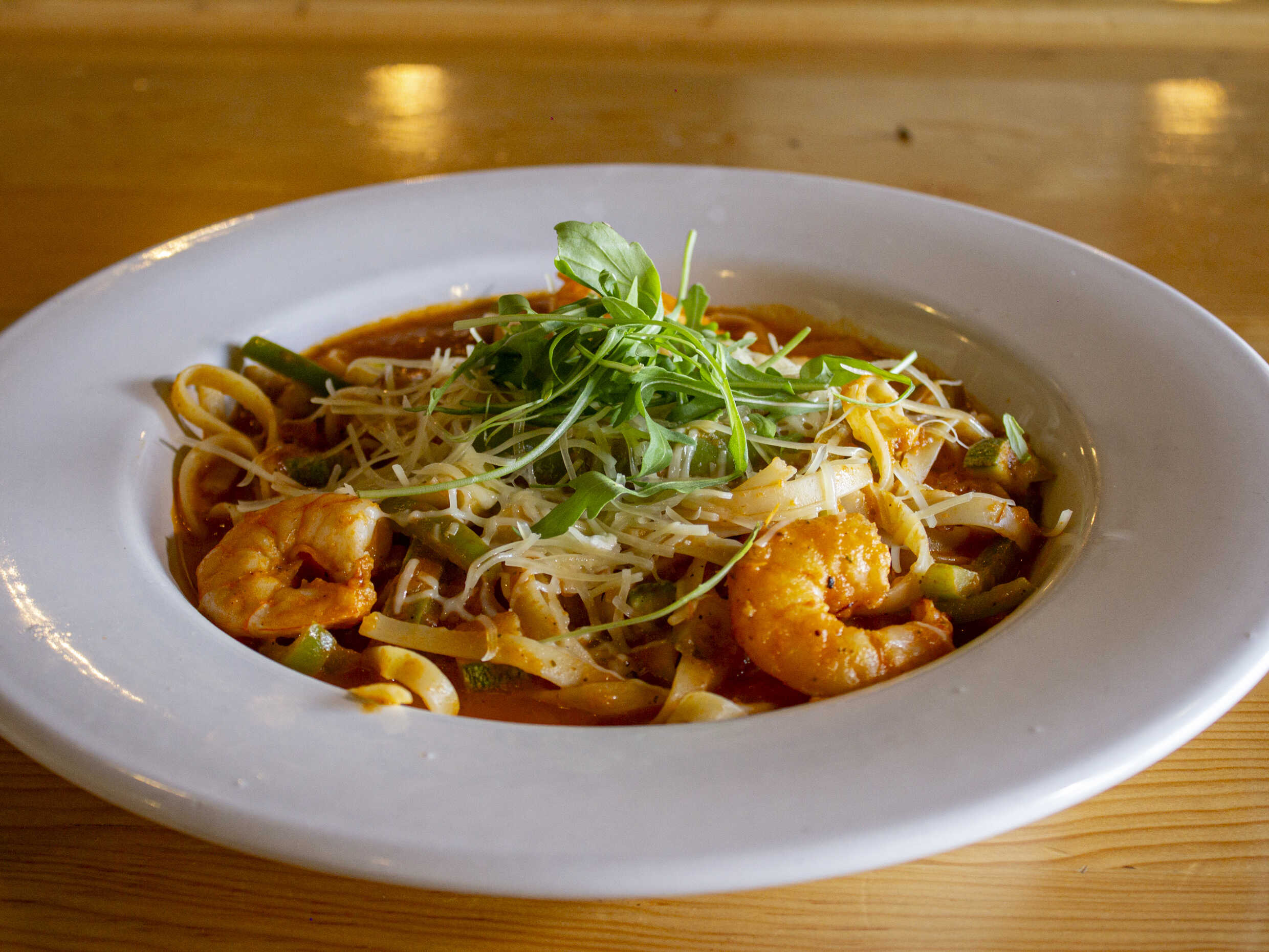 fettuccine en salsa hecha a base de tomates y vejetales salteados. Acompañala con pollo o camaron