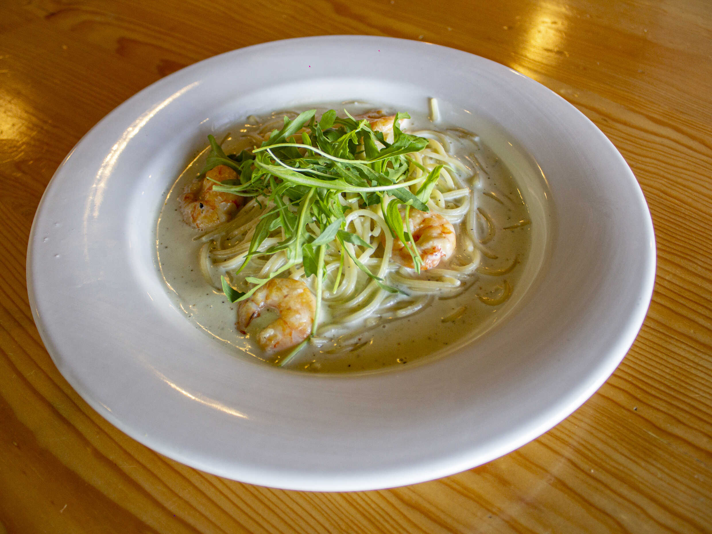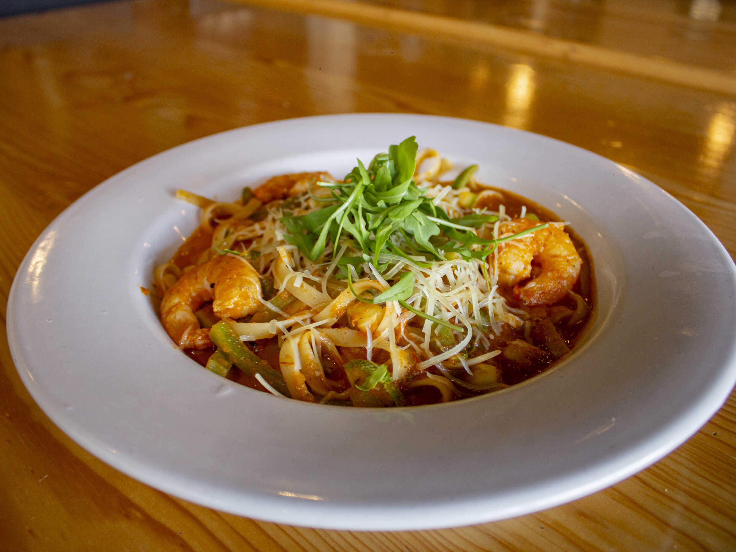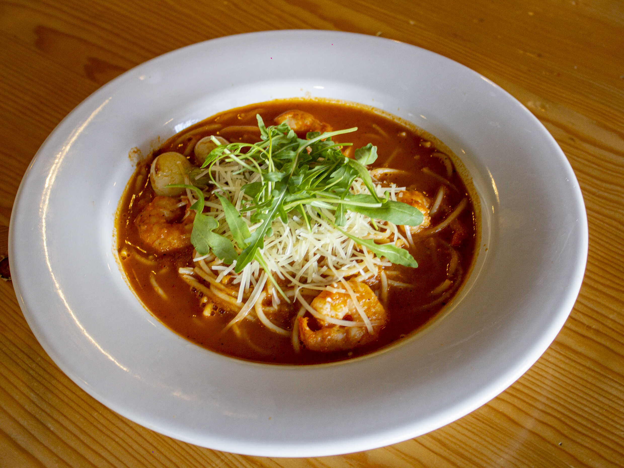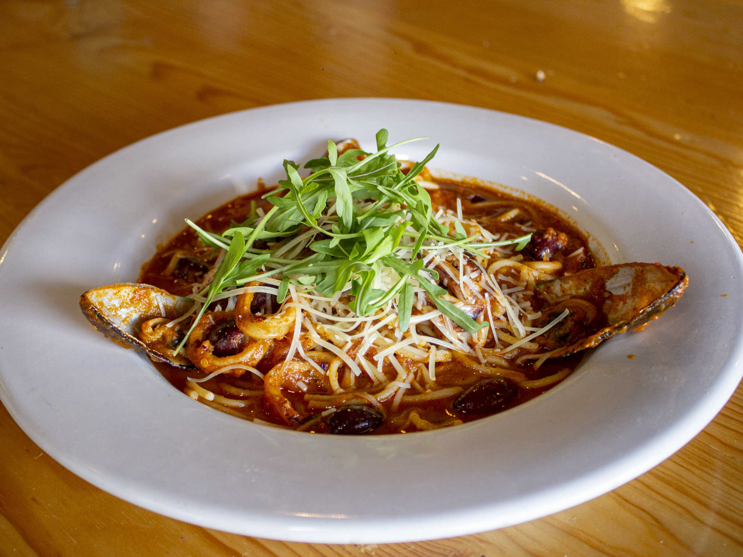 Spaguetti hecho a base de camarones calamares, aceituna calamata, salsa pomodoro, chile de arbol y vino blanco
