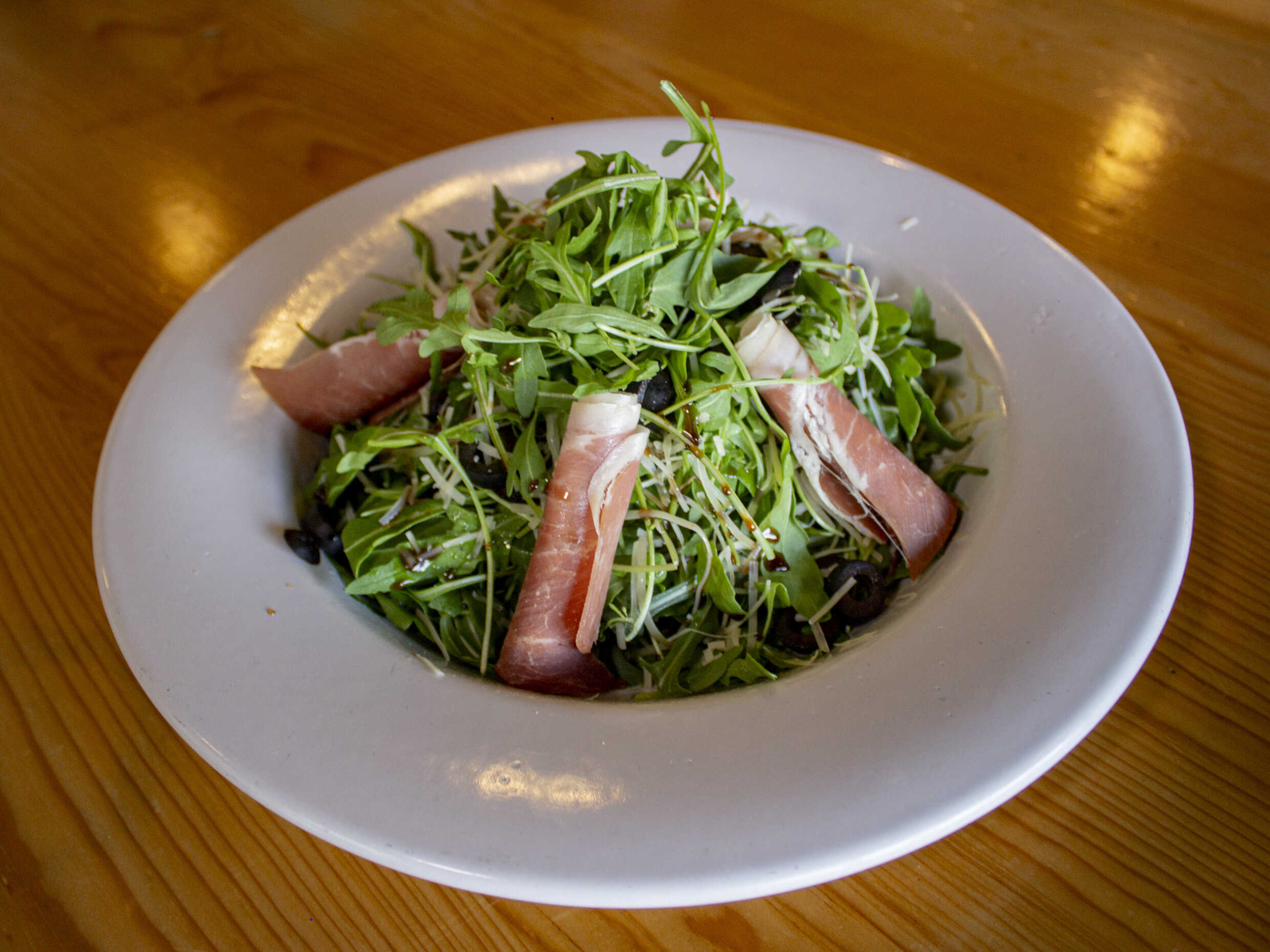 Arugula, aceituna negra, jamon serrano, queso parmesano, vinagreta de ajo rostizado, reduccion de balsamico.