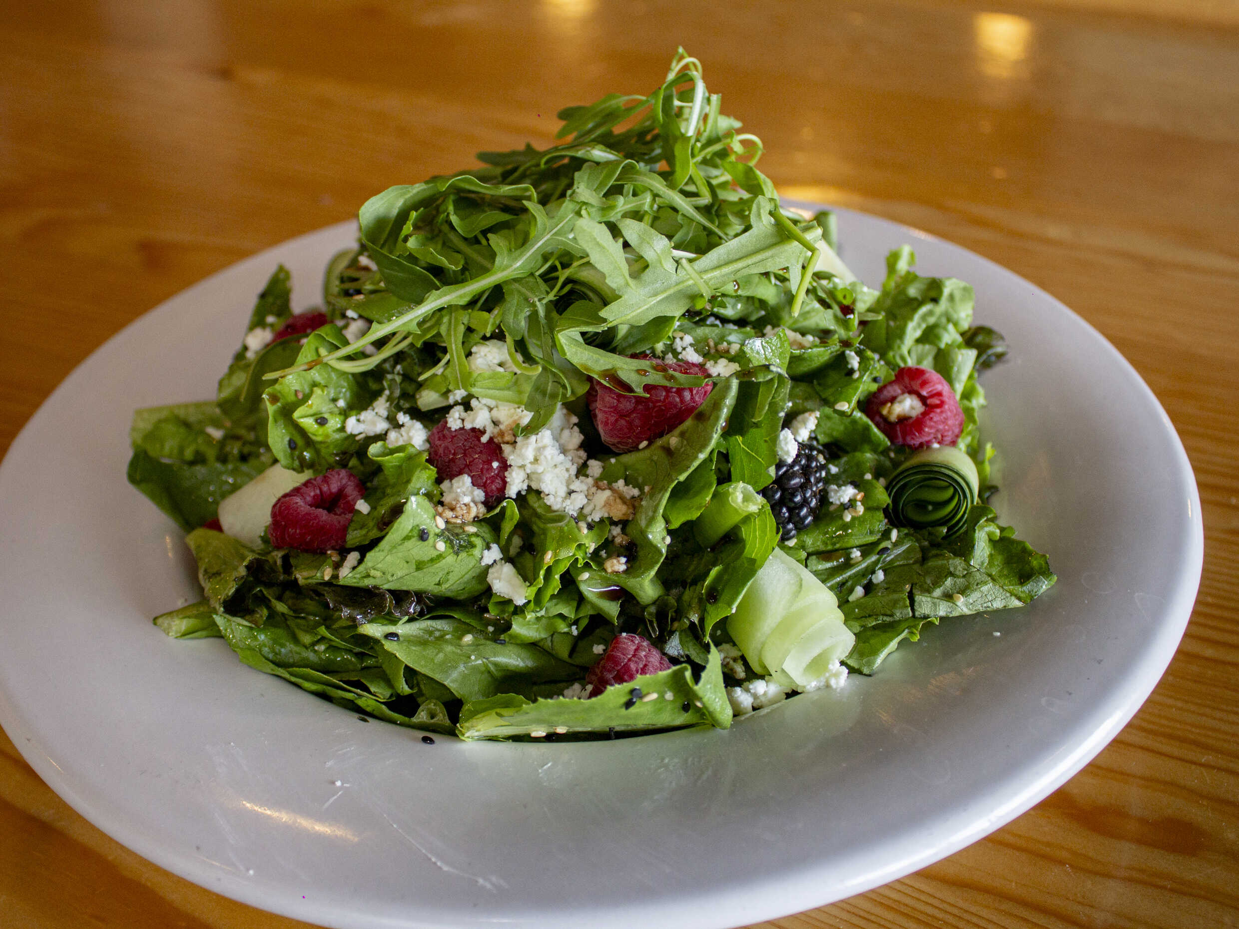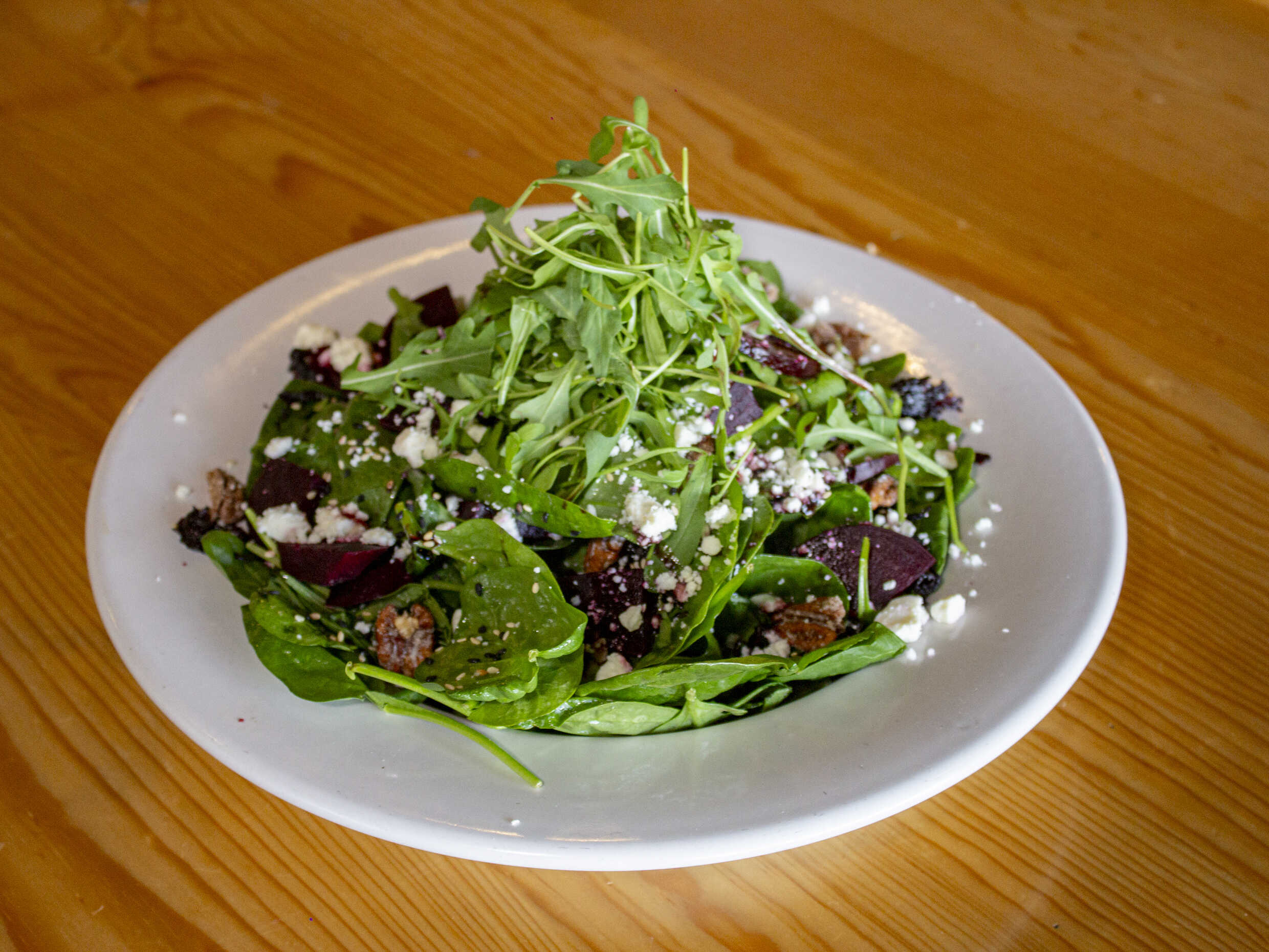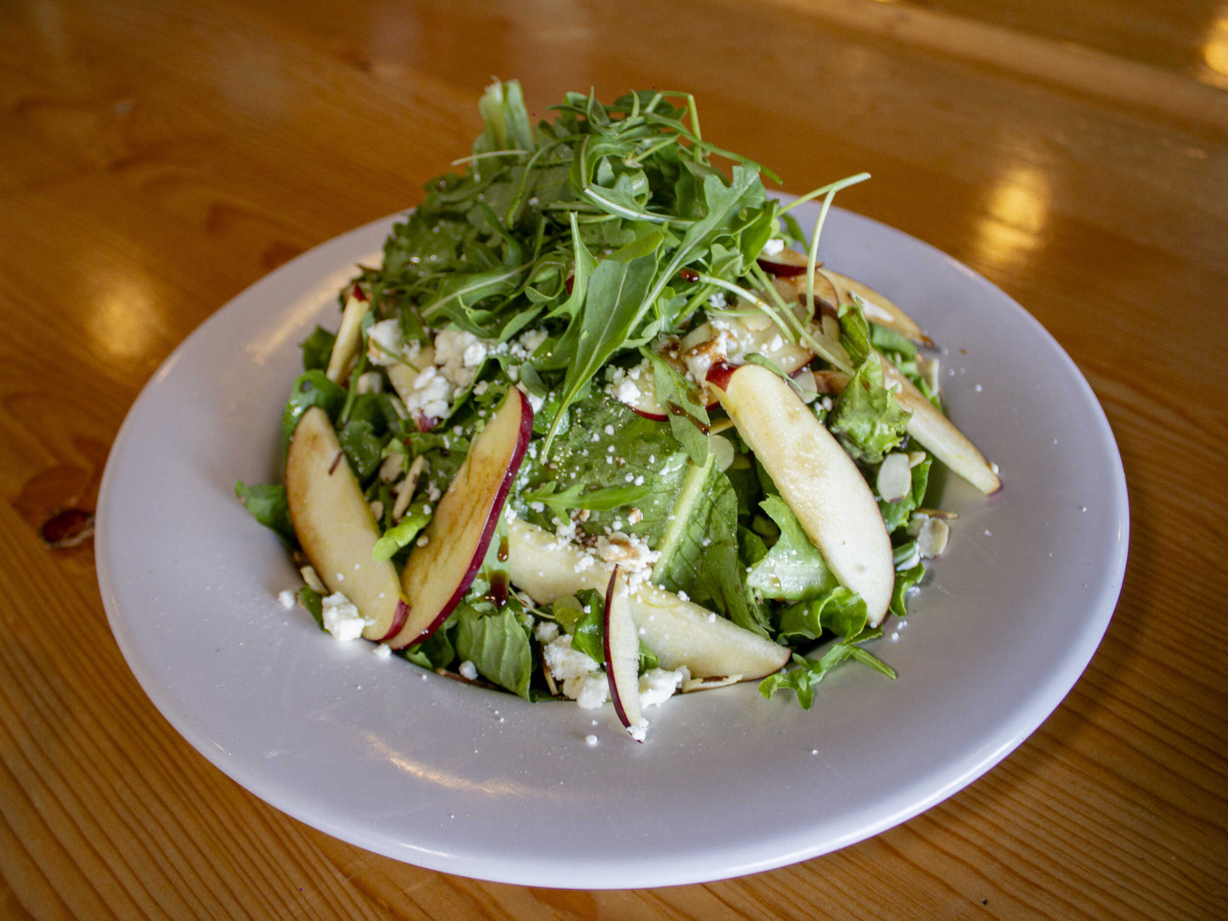 Mix de lechugas, Manzana, almendra, queso feta, vinagreta de frutos rojos, arugula y reduccion de balsamico.