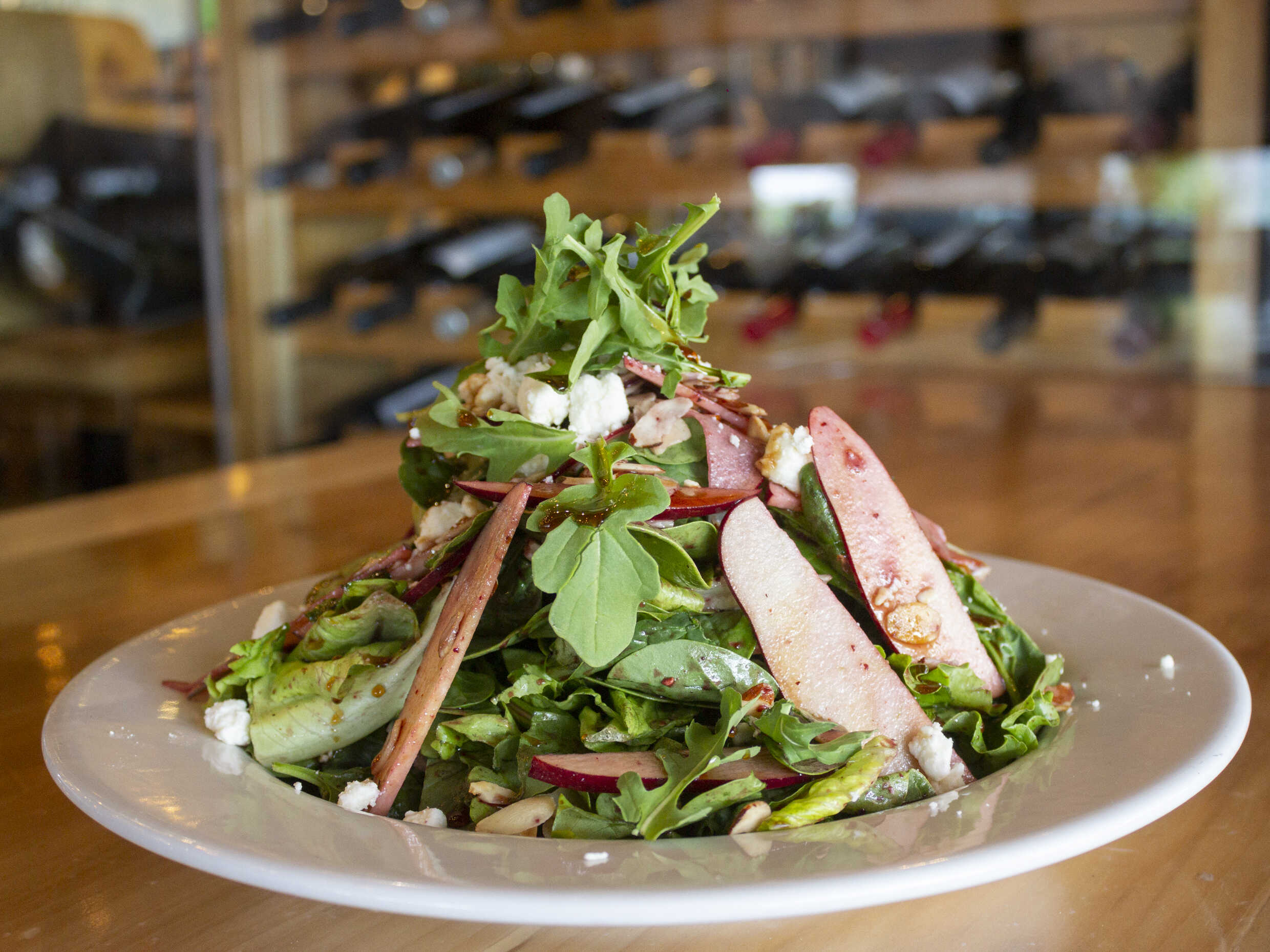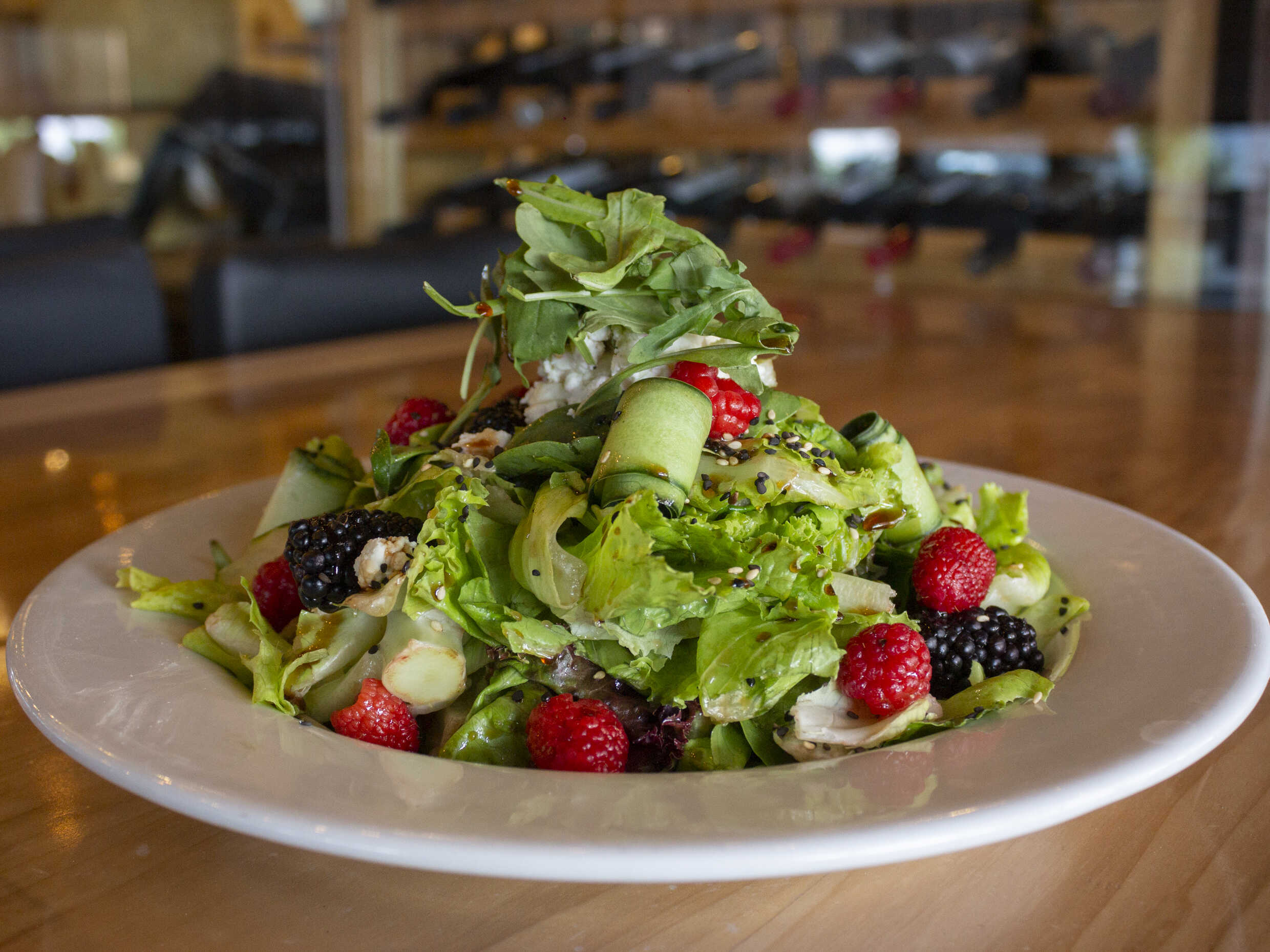Mix de lechugas, manzana, almendra, queso feta y arúgula con vinagreta de frutos rojos.