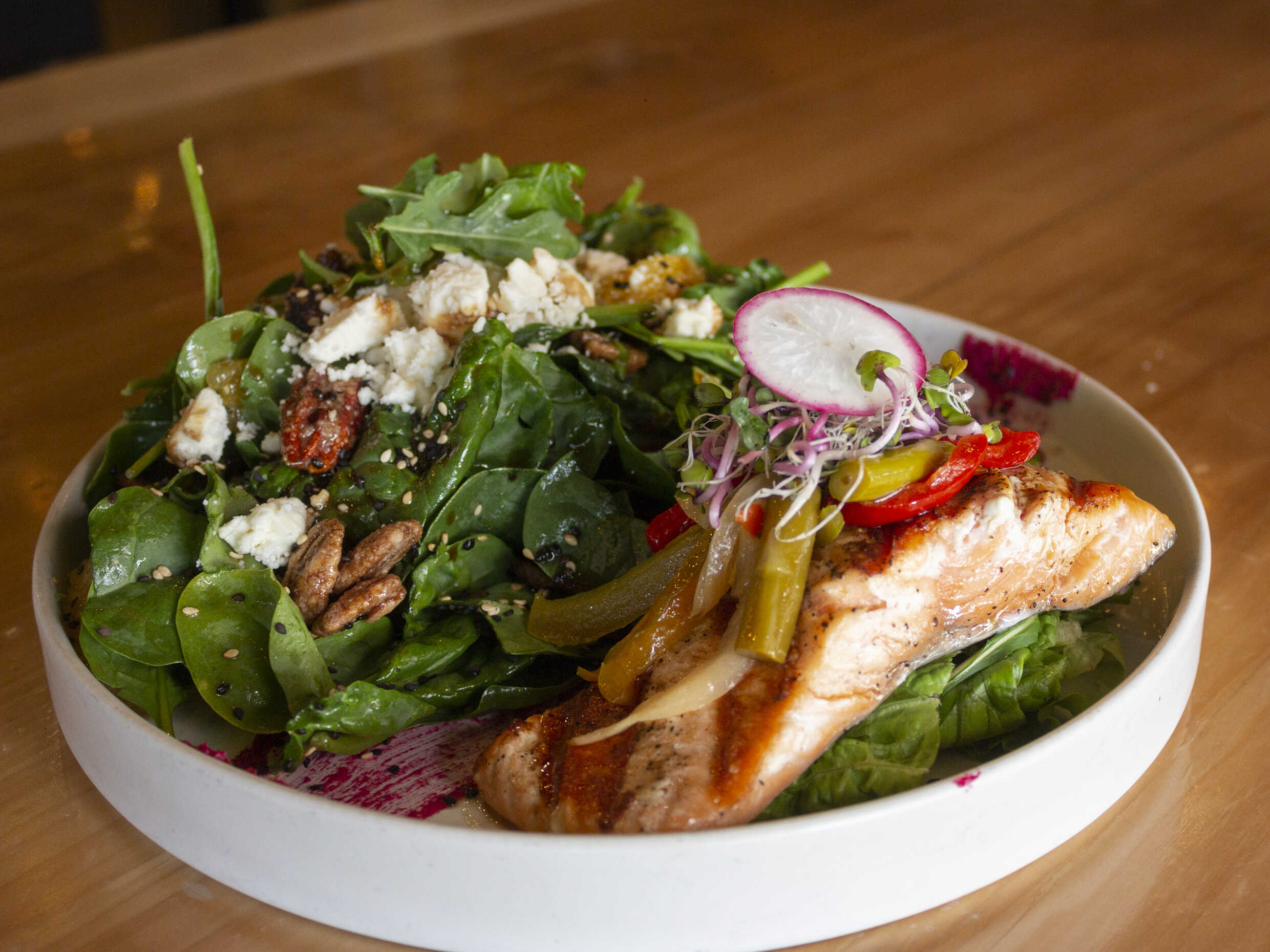 Filete de salmón 240 gr fresco servido en una cama de espinaca, supremas de naranja y nuez caramelizada.