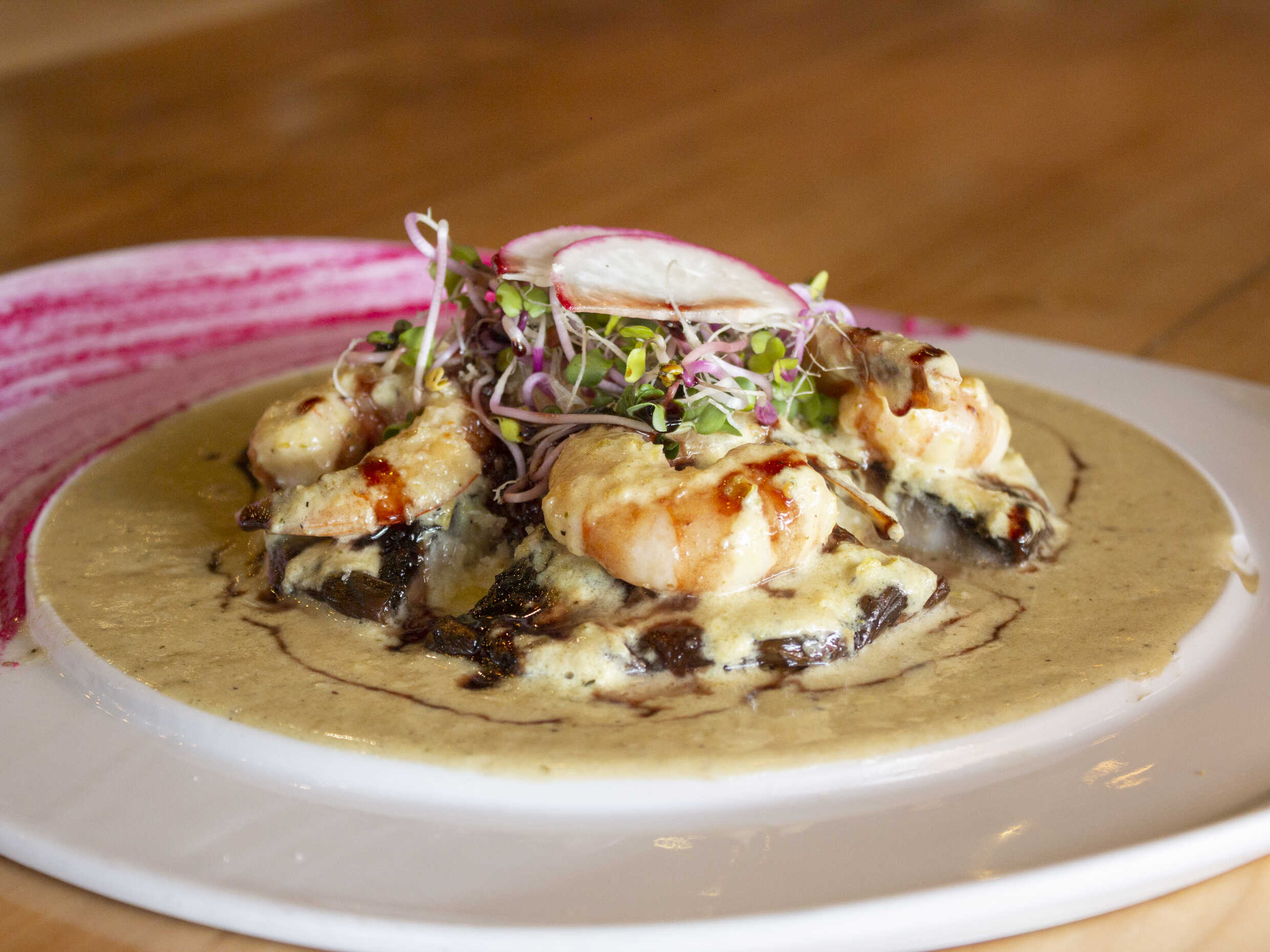 Hongos asados a la leña con camarones salteados en salsa pesto.