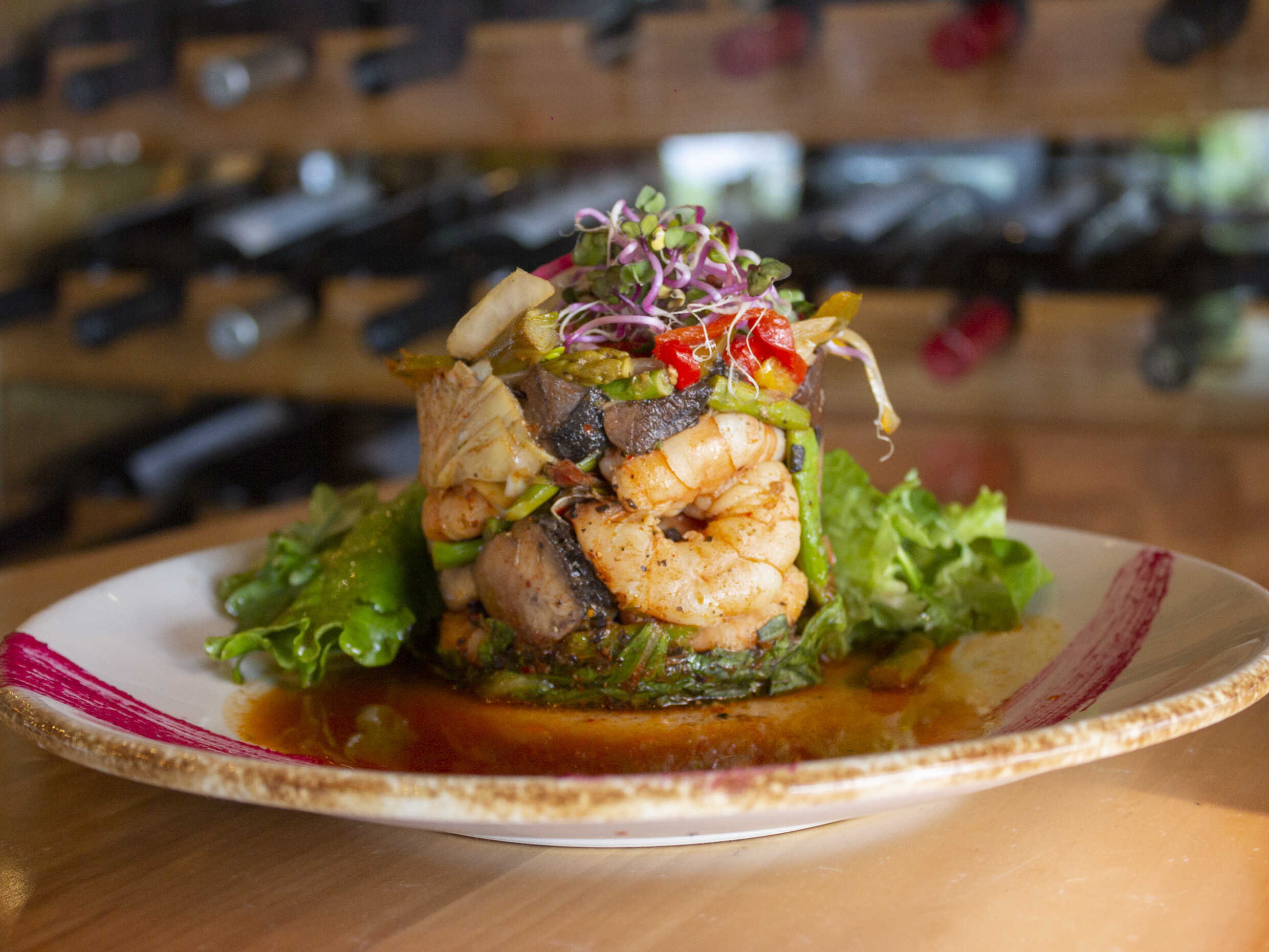 Salteado de camarones 160 gr hongos portobello, espárragos, alcachofas, chile de árbol y hierbas finas.