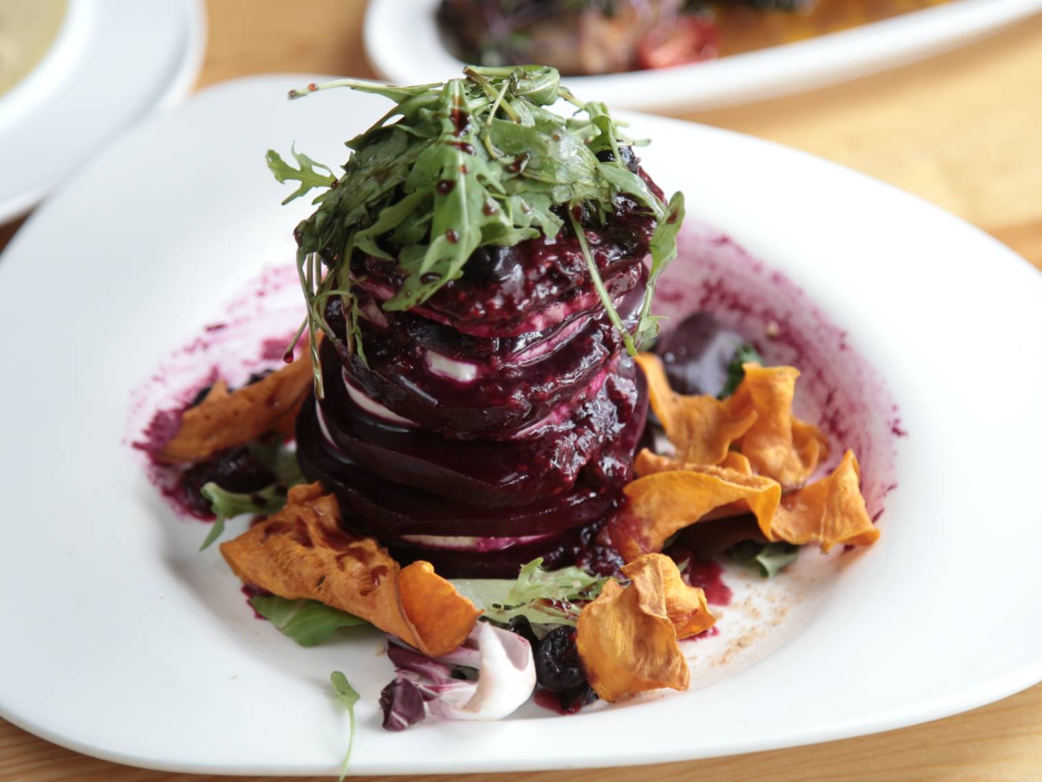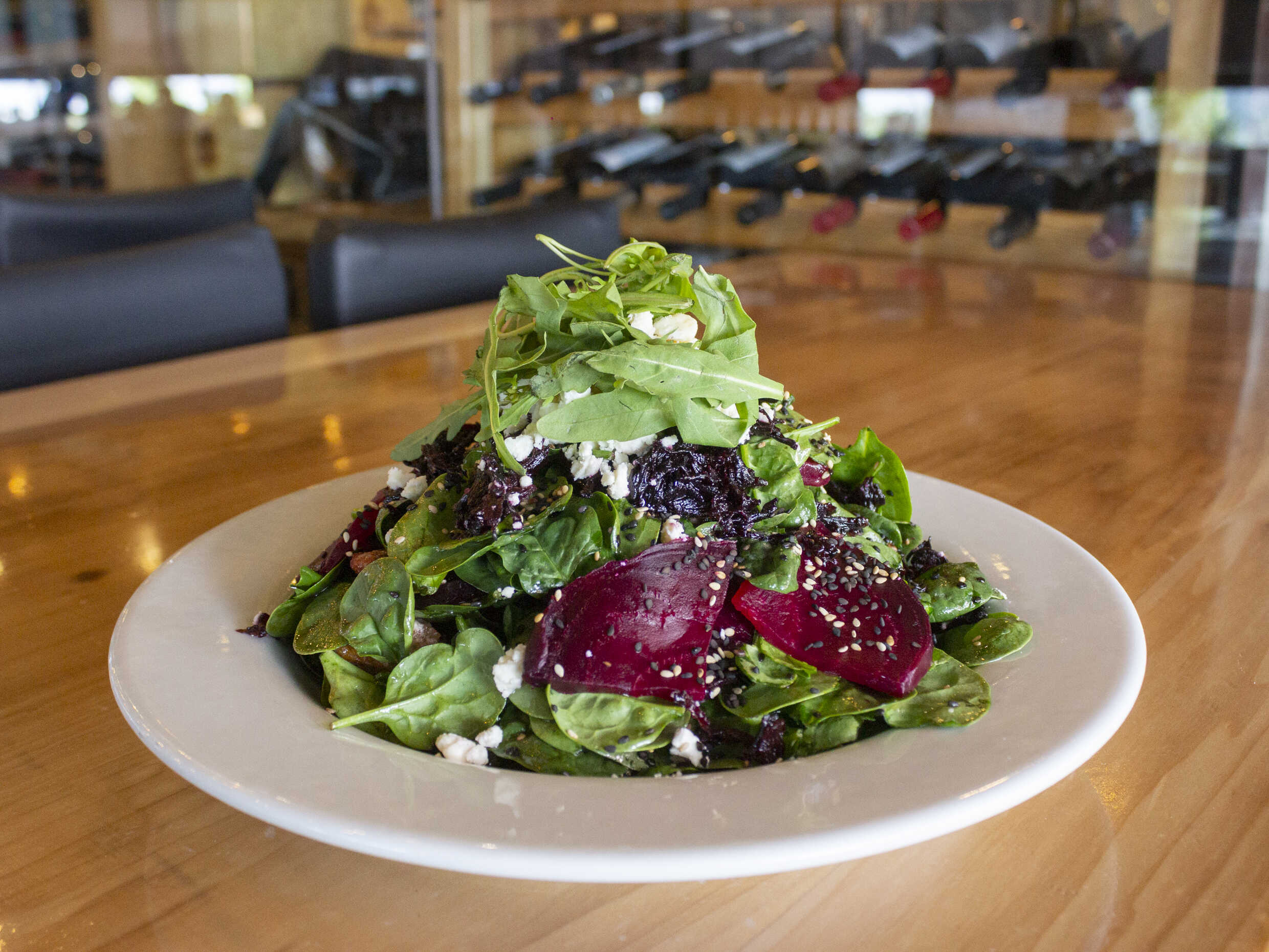 Espinaca baby servida en una cama de betabeles, acompañada de nuez caramelizada, ajonjolí tostado, vinagreta de jamaica y queso feta.