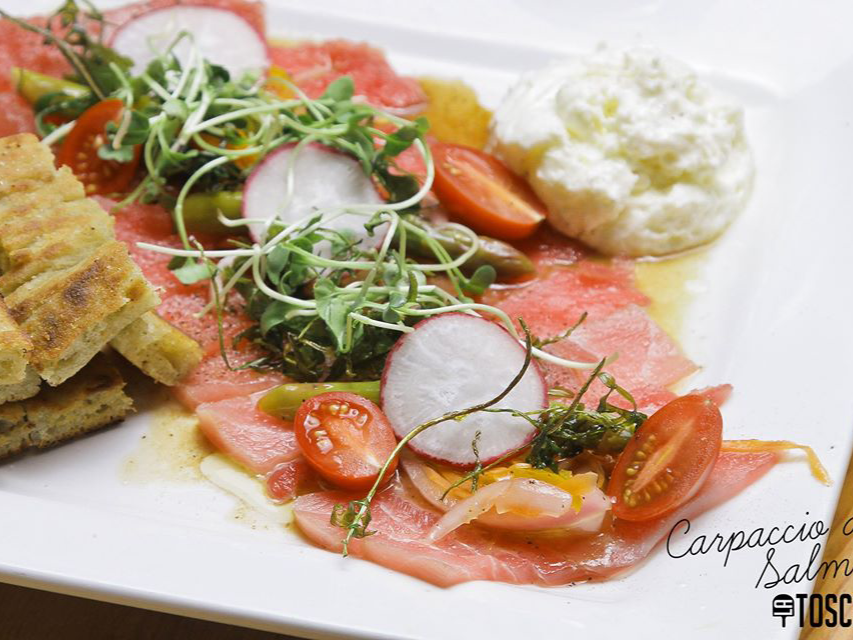 Láminas de atún ó salmón fresco maceradas, acompañadas de espuma de ajo, escabeche de morrones y crotones de pan horneado en casa.