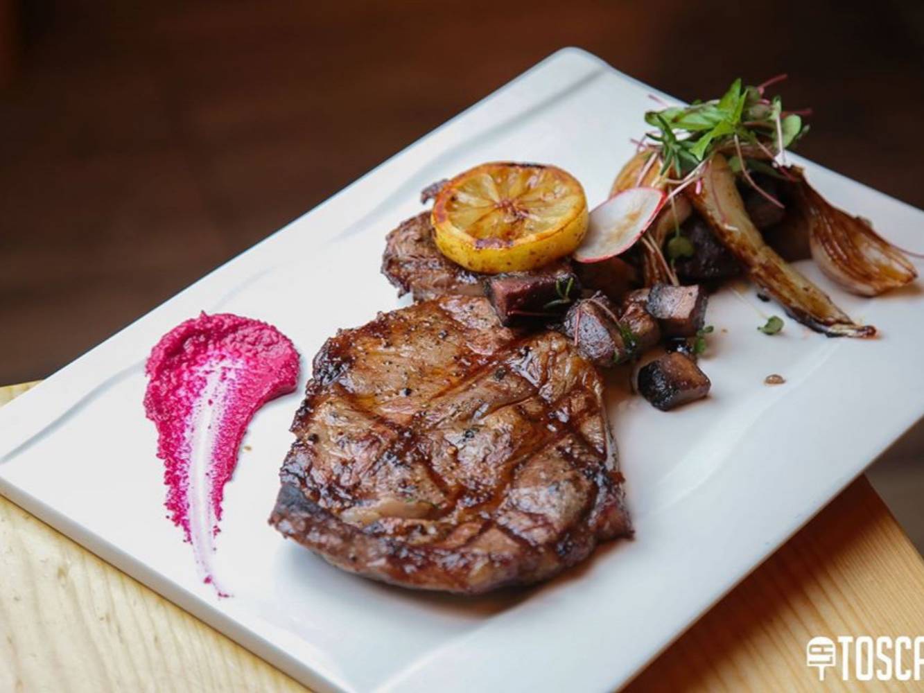 Rib eye 400 gr asado a la leña con guarnición de champiñones en vino tinto, cebollas cambray caramelizadas y hierbas finas de la casa.