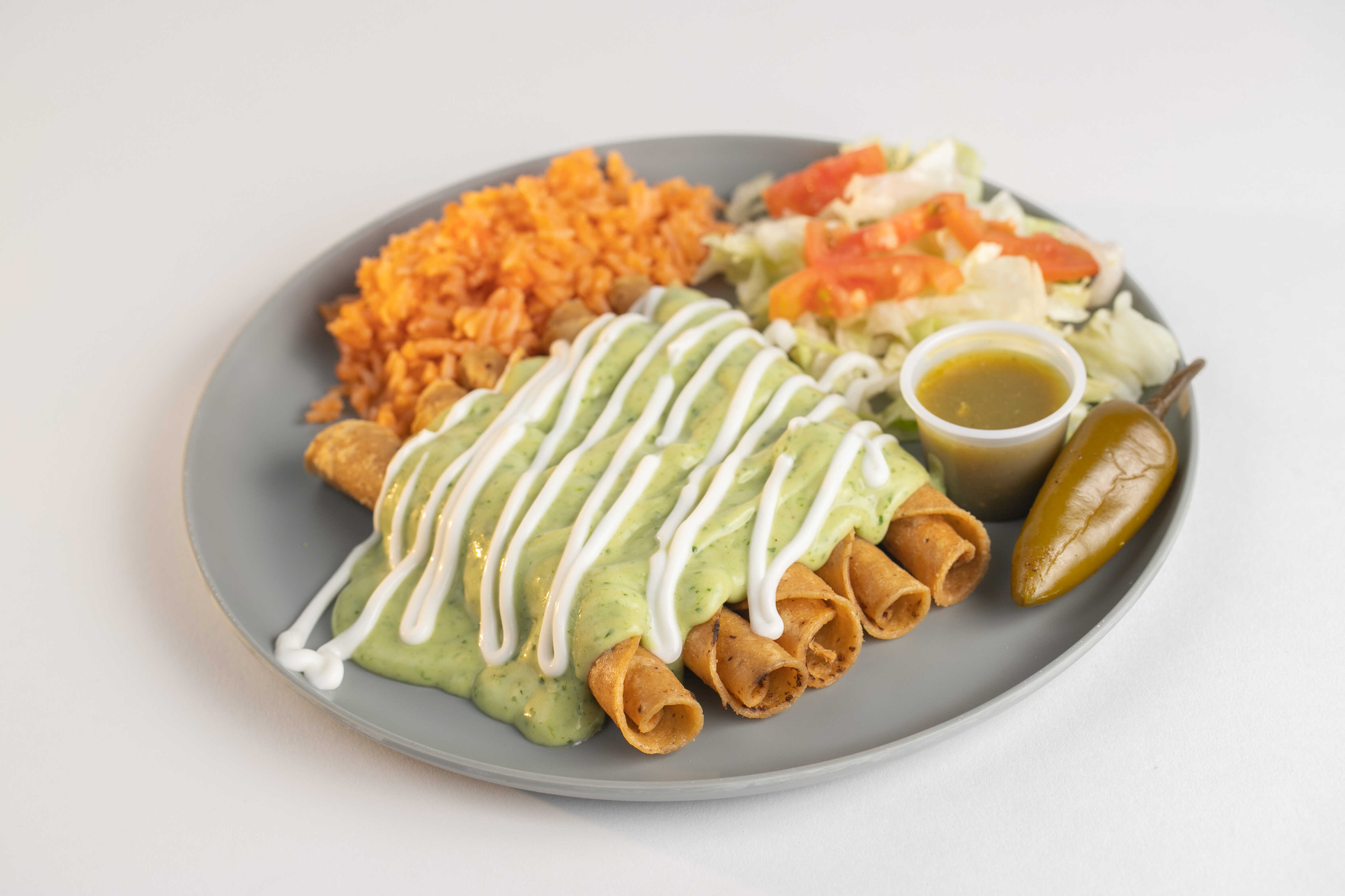 Bañadas en nuestra Salsa de Guacamole con Crema, servidas con Lechuga, Tomate y una porcion de Arroz.