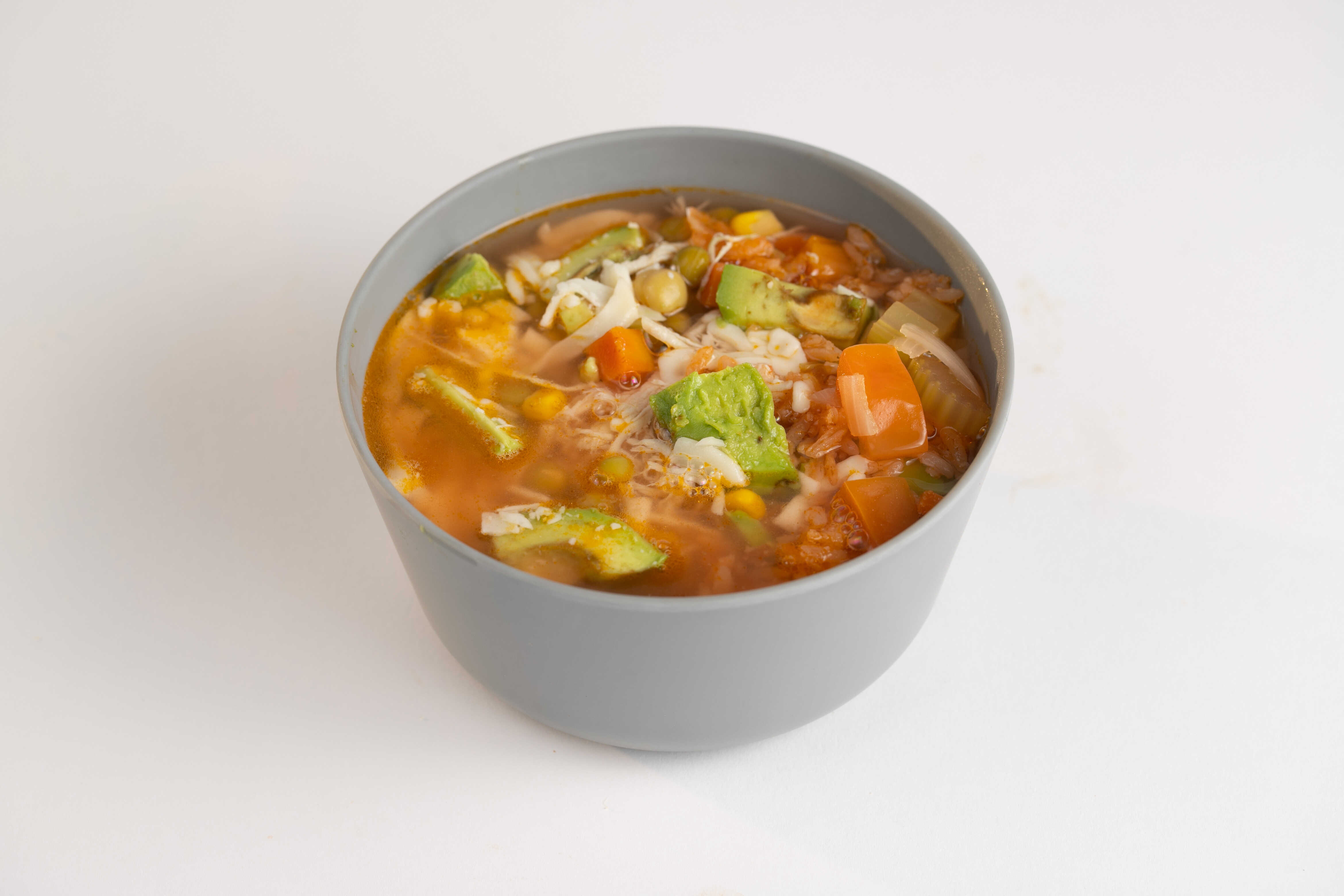 1/2 Litro de Consome con Arroz y Pechuga desmenuzada, Aguacate y Queso Panela.