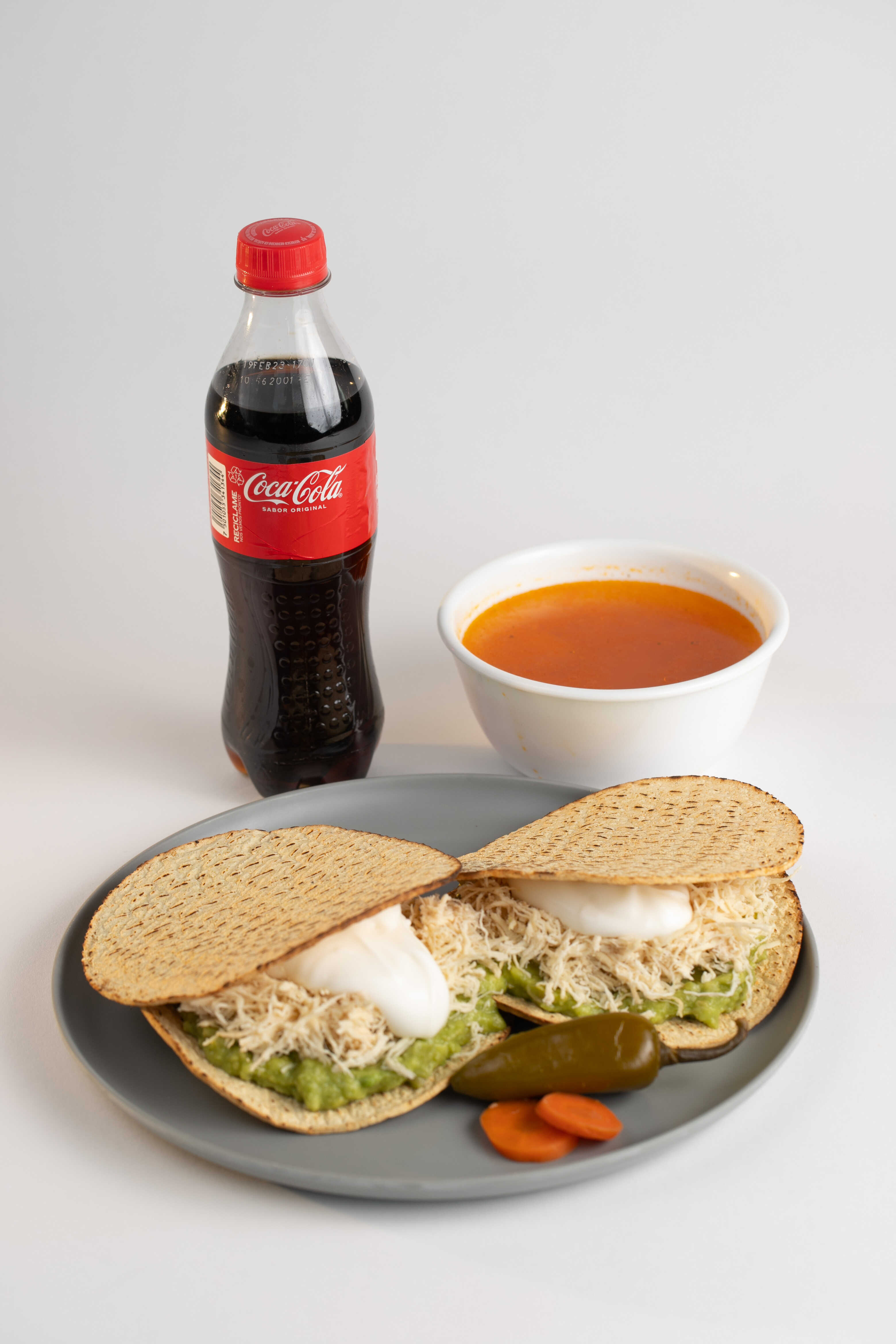 2 Tostadas deshidratadas con Guacamole, Pechuga de Pollo desmenuzada y Crema + Complemento a elegir + 1 Refresco.