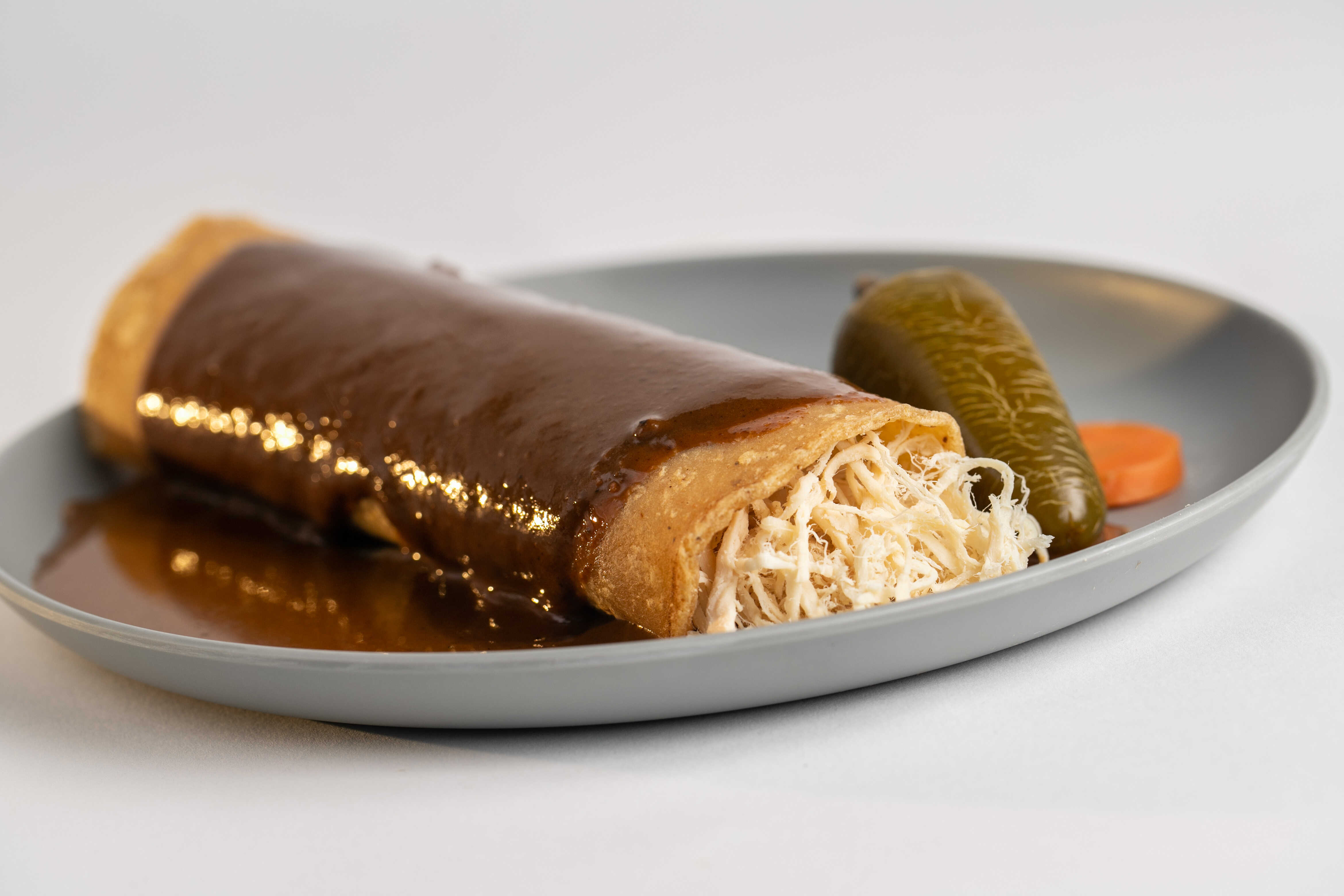 1 Taco Gigante con Pechuga de Pollo desmenuzada, nuestra deliciosa Salsa de Mole con una porción de Arroz.