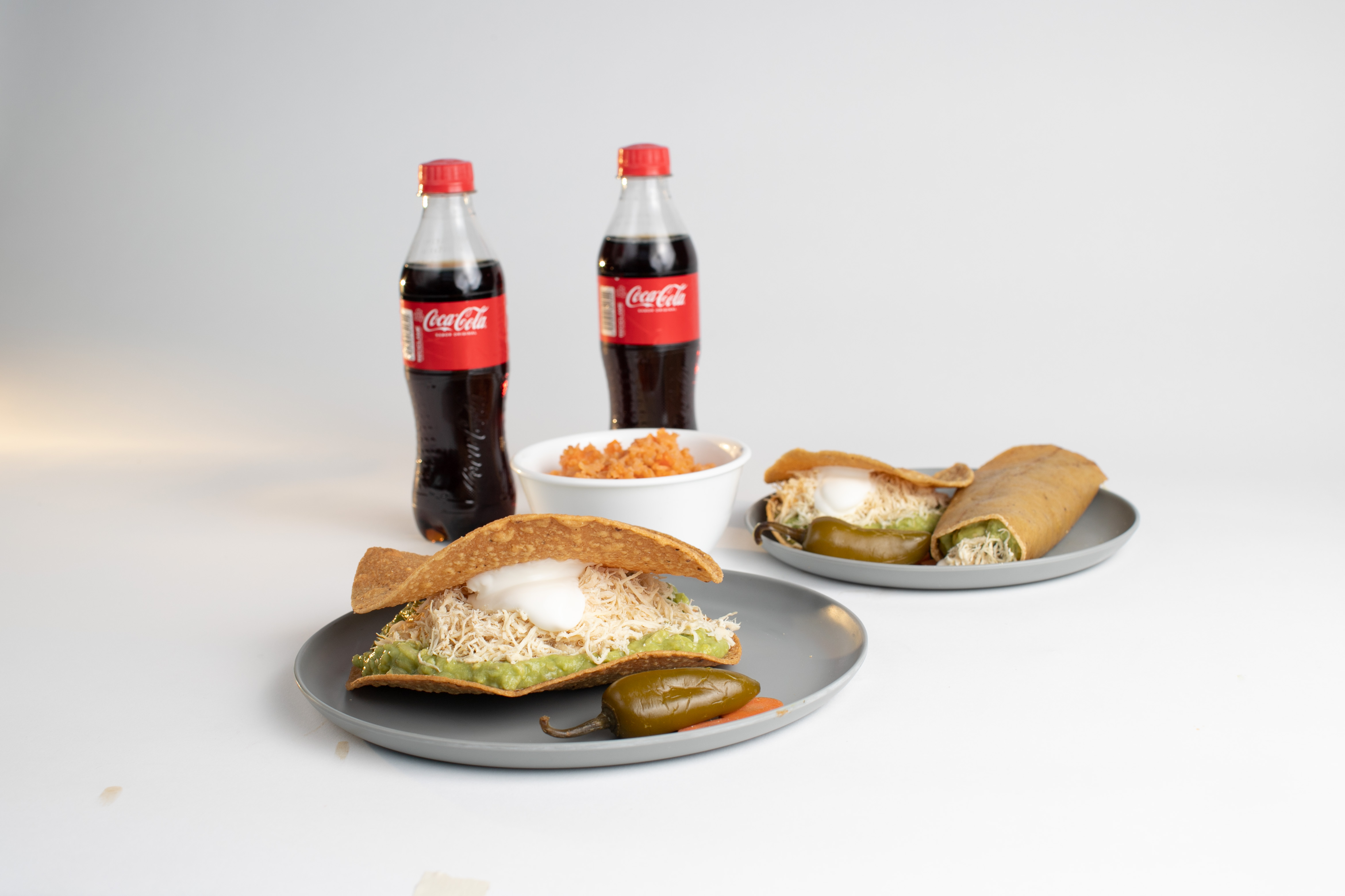 2 Tacos Gigantes con Aguacate Pechuga de Pollo desmenuzada, y Crema, acompañados con 1 complemento a elegir y 1 Refresco 355ml.