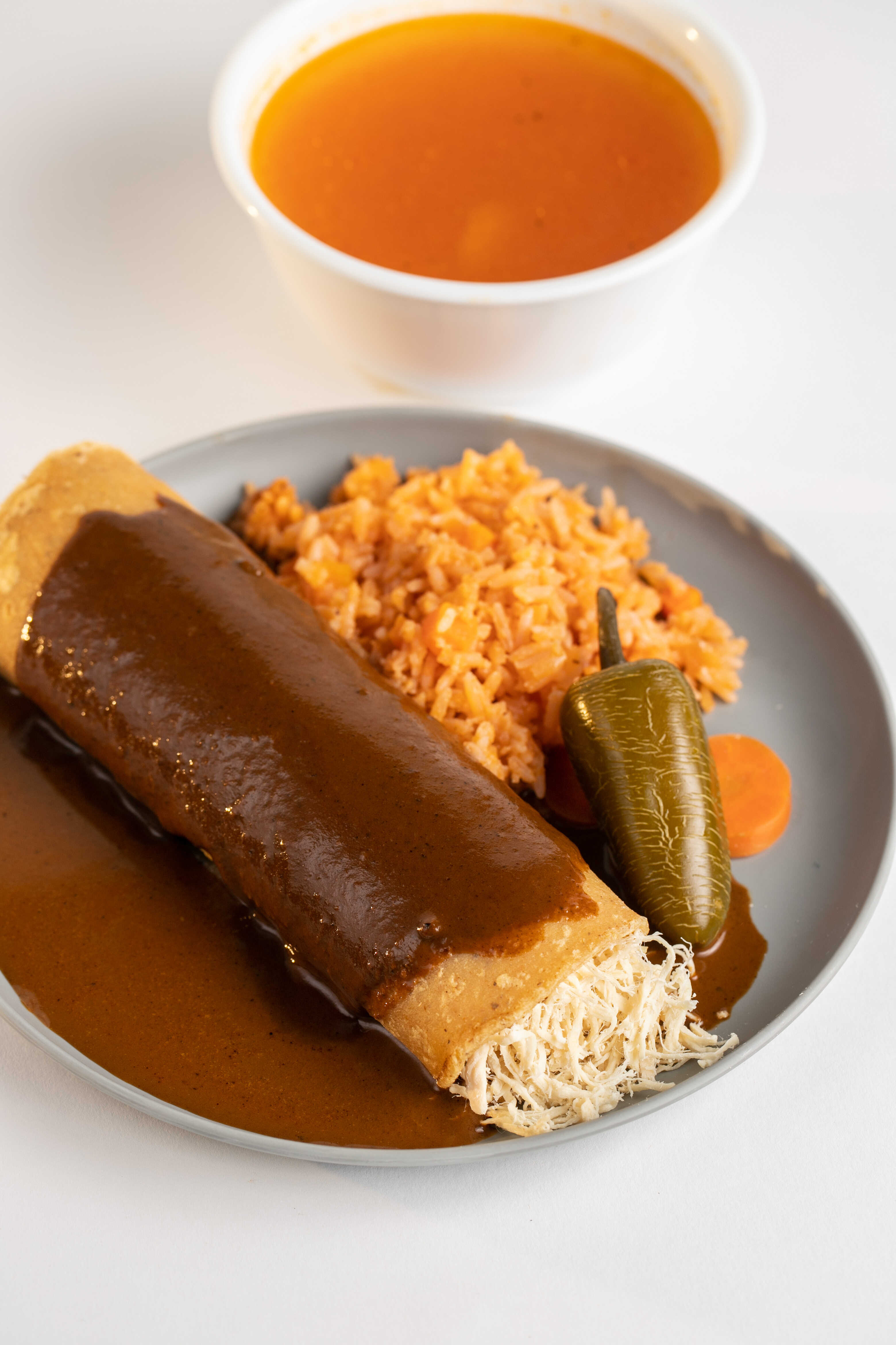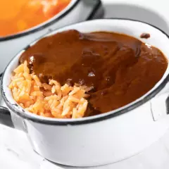 Pechuga desmenuzada bañada en delicioso Mole con guarnición de Arroz rojo.