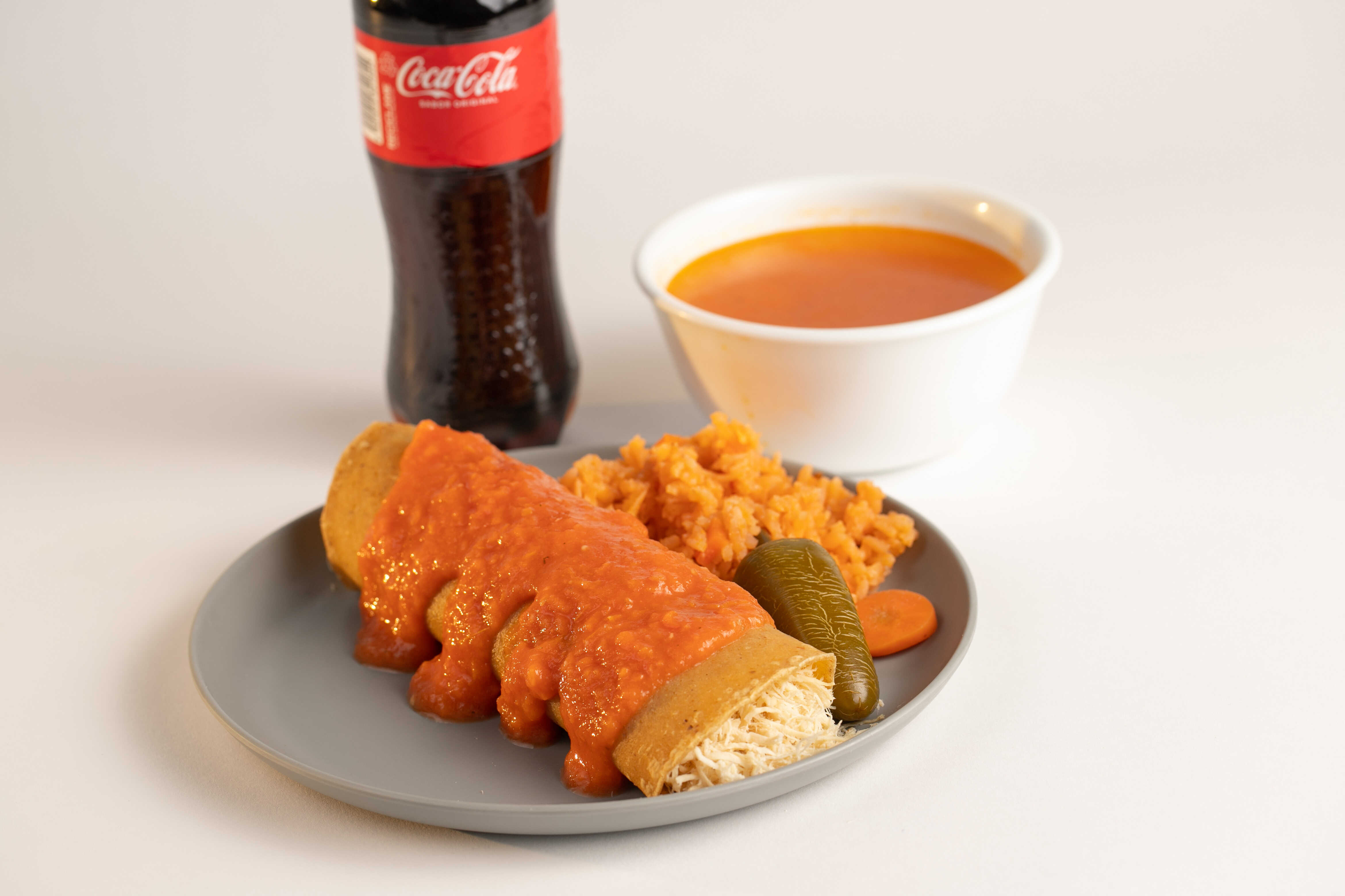 1 Delicioso Taco Entomatado Gigante con Pechuga de Pollo desmenuzada, nuestra Salsa de Tomate y con una porción de Arroz + 1 Complemento a elegir + 1 Refresco 355ml.