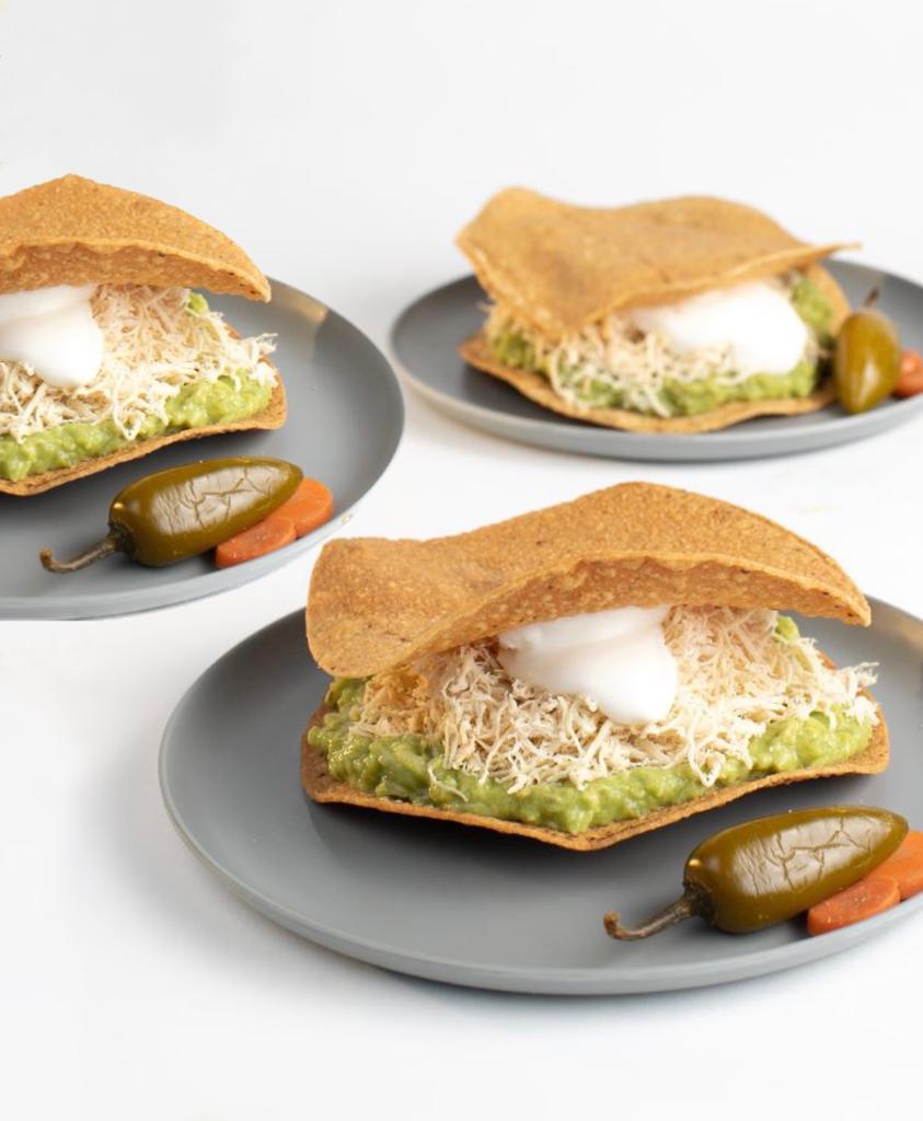 Incluye 3 Tostadas con guacamole, pechuga de pollo desmenuzada y crema